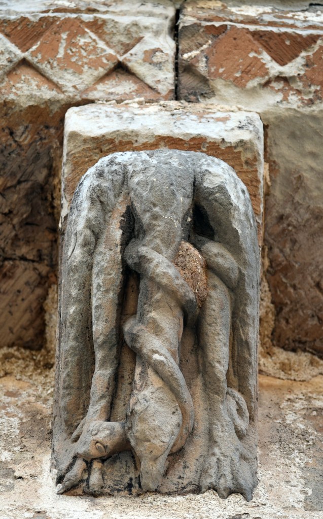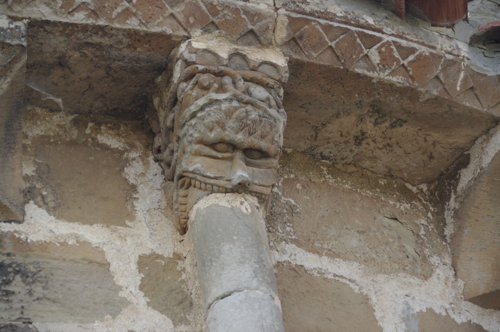 Tan pronto como el Colega aparca el coche aparece Begoña, dispuesta a abrirnos la puerta y mostrarnos su iglesia por dentro y por fuera. Observa que los contrafuertes apean los arcos fajones del interior y que todo el alero está decorado con modillones geométricos y unos pocos con figuras humanas y animales. El ábside se divide en tres paños mediante columnas geminadas rematadas con animales y una escena de cacería de osos. Una de ellas remata con una gran cabeza que parece querer comerse la columna (lo que se interpreta como la amenaza que suponen las herejías para la iglesia). Este glutón es uno de los detalles que vinculan la iglesia de Villavega con Rebolledo de la Torre y el entorno del Maestro de Piasca. Entre los canecillos del muro norte destacan un lector y un ave con una serpiente enroscada al cuello. El testero remata en una espadaña, maciza en su cuerpo inferior, en el intermedio se abren dos vanos en los que se instalan las campanas, el más elevado se remata a piñón; el conjunto da sensación de solidez a pesar de algunas resquebrajaduras que también se repiten en los contrafuertes añadidos al ábside.