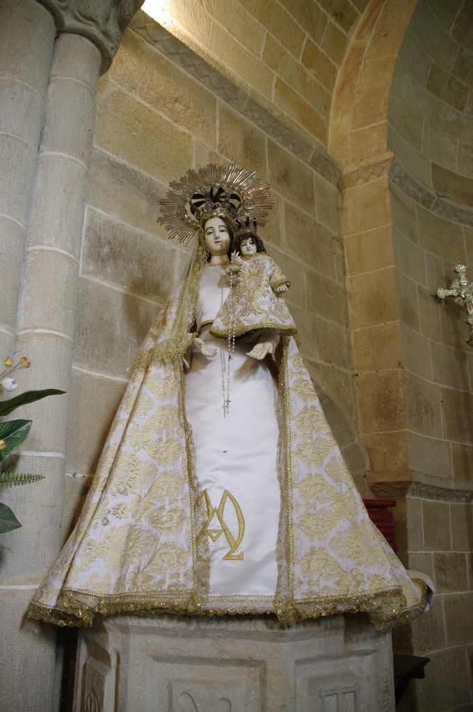 En la iglesia se rinde culto a la Virgen del Amparo -procedente quizá de la ermita-, que se nos muestra con el Niño en brazos, obra de los siglos XVII o XVIII. Las caras de la Virgen y el Niño son de marfil y fue traída de Filipinas por una religiosa, nos aclara Begoña. En el muro sur una pequeña talla del santo titular, de los siglos XV o XVI.