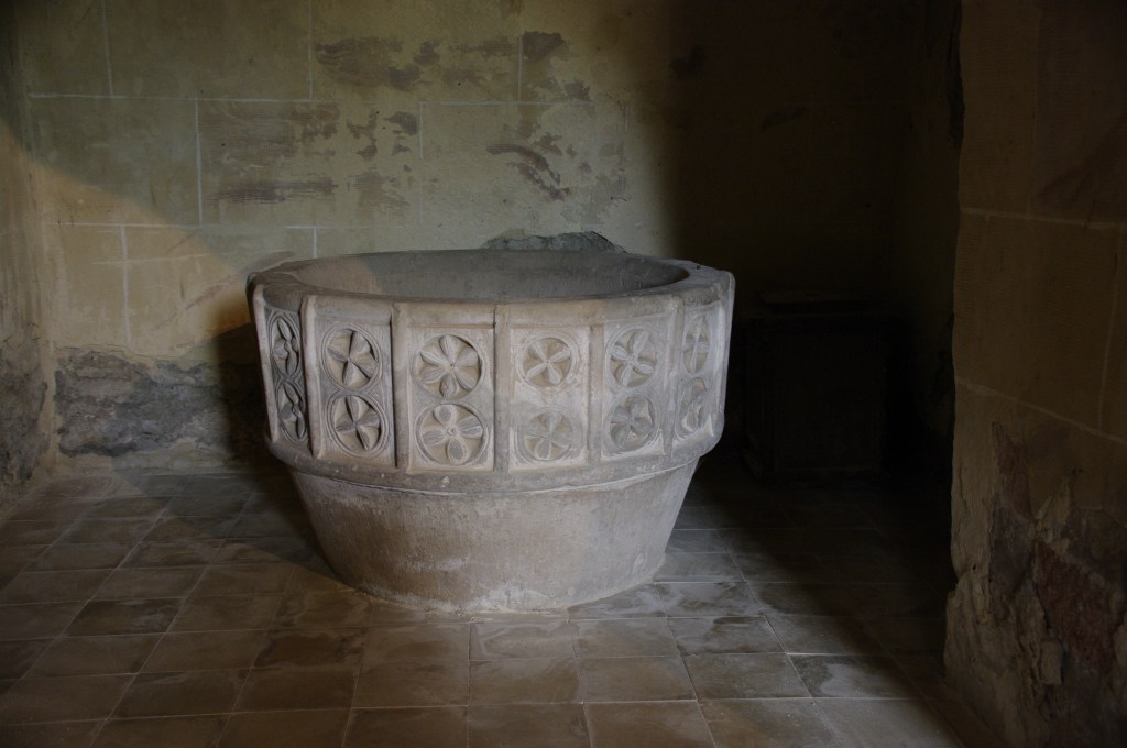 La pila bautismal es una sólida pieza de piedra arenisca y dos cuerpos; el inferior es un troncocónico invertido sin decoración; el superior es de forma cilíndrica, aderezada con flores cuadrifolias inscritas en círculos, “todo alrededor de la pila, no como la de Cillamayor, que solo está tallada la mitad”, puntualiza Begoña.