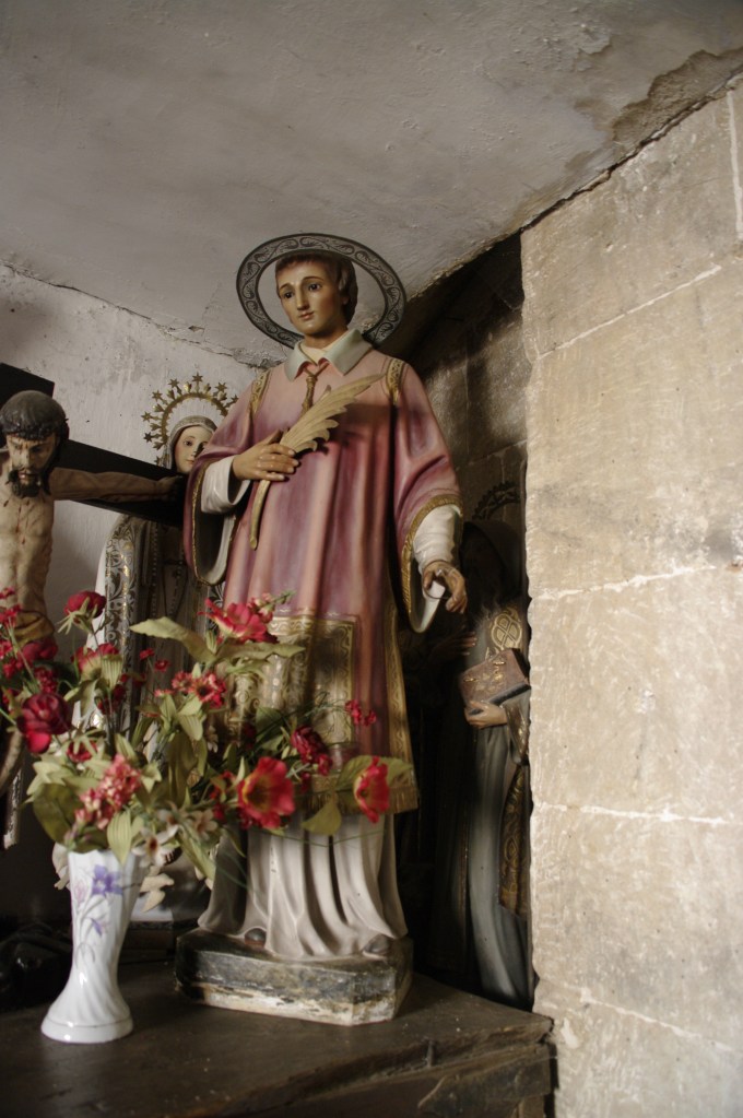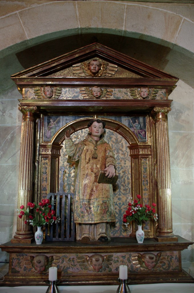 Recorriendo la imaginería del templo identificamos una imagen San Lorenzo. Es una talla de madera que luce esplendorosa, como recién acabada, de no ser porque le falta la mano derecha, en la izquierda porta un libro. La propia Begoña nos cuenta la historia de este pobre santo, que gozaba de la devoción de los feligreses hasta que en la guerra civil cuando entraron las tropas republicanas, le cortaron la mano y lo abandonaron en el campo. Al acabar la guerra, los feligreses compraron una efigie de escayola lo más parecida posible al santo desaparecido, esto es, con sayo rojo, al que le añadieron las inevitables parrillas. Cuando los devotos se habían acostumbrado a la presencia del nuevo San Lorenzo unos vecinos hallaron en el campo al titular maltratado, lo recogieron y, considerando su lamentable estado, lo guardaron en una casa del pueblo.
