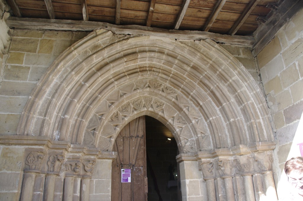 Para acceder al interior hay que traspasar la hermosa portada abierta al sur, con cinco sencillas arquivoltas, las dos primeras adornadas con dientes de sierras, animales, vegetales y figuras humanas, mutilada en la parte superior al añadírsele el atrio en una de las reformas antes citadas.