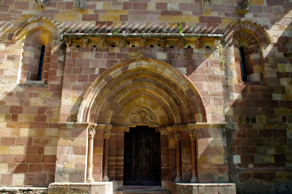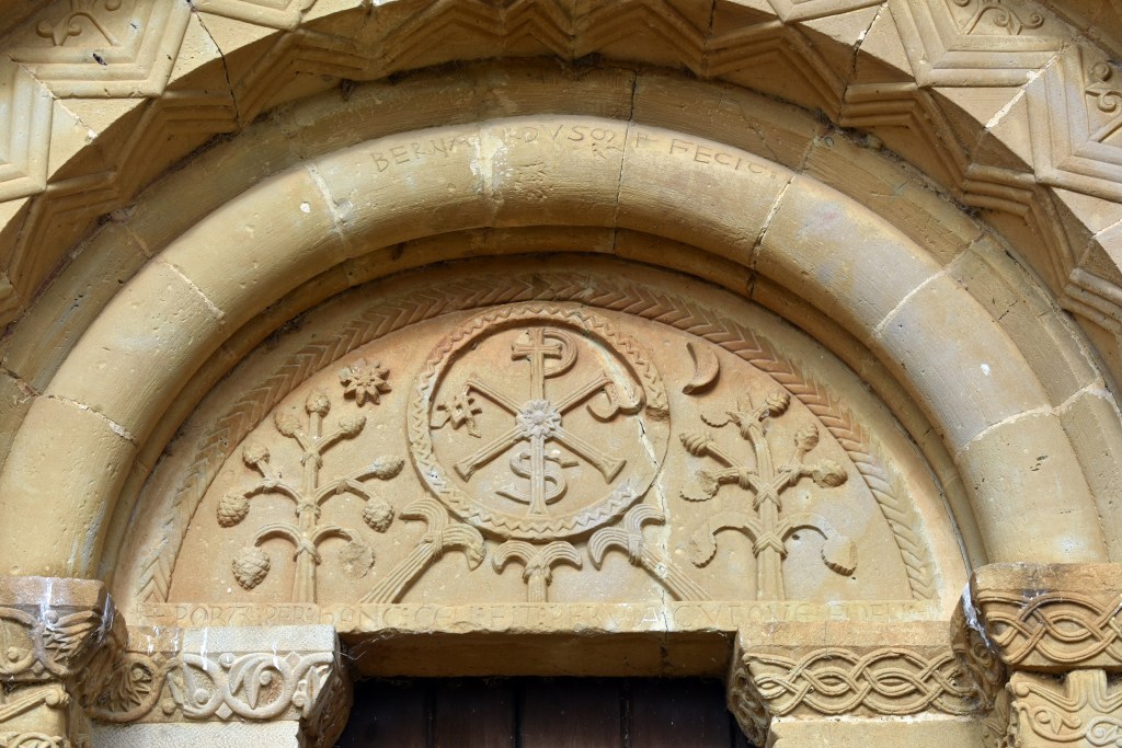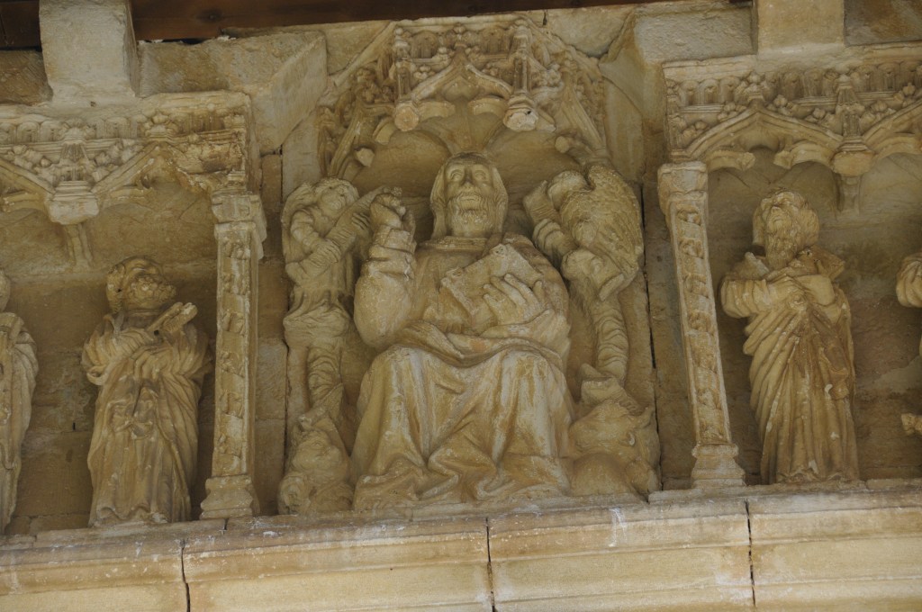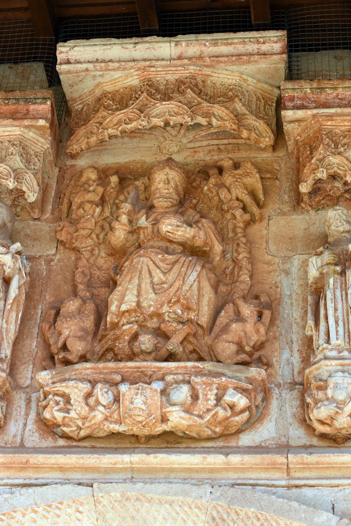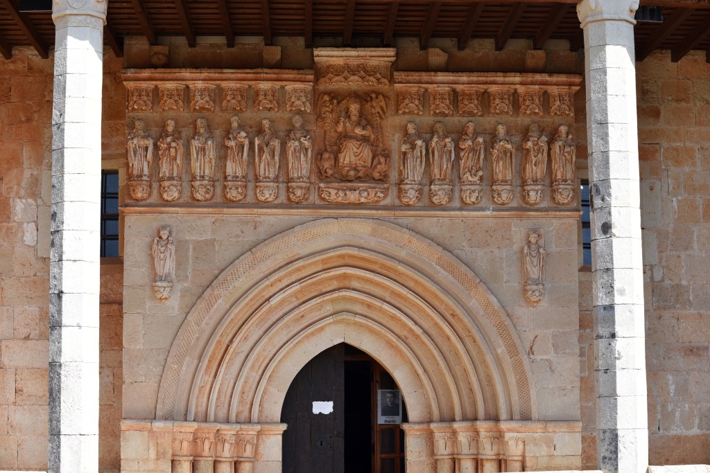 Allí encontramos a Chemari, que en esos momentos despide a un visitante. Llegamos atraídos por el friso de su portada -del siglo XIV, ya plenamente gótico- y nos encontramos varias sorpresas. Vaya por delante que solo el friso, en el que se aprecia la influencia de Carrión y Moarves, vale la pena el viaje. Se trata de un Cristo en majestad inscrito en mandorla y rodeado del Tetramorfos; en su mano izquierda sostiene la bola del mundo mientras bendice con la derecha. Flanquean el conjunto los doce apóstoles, apeados en peanas con decoración vegetal y protegidos por doseles. La portada es sencilla, consta de cinco arquivoltas apuntadas, con guardapolvos de rombos, con capiteles de ornamentación vegetal.