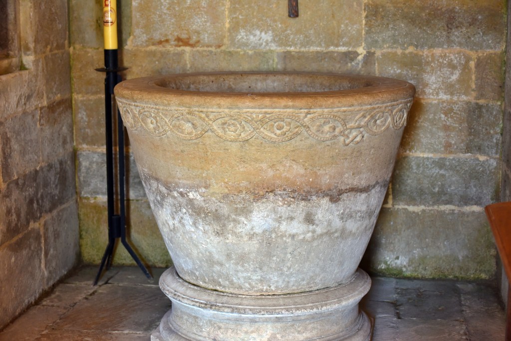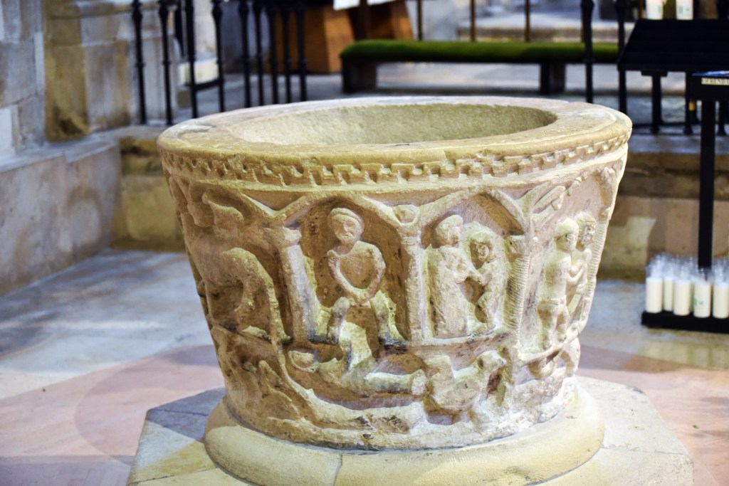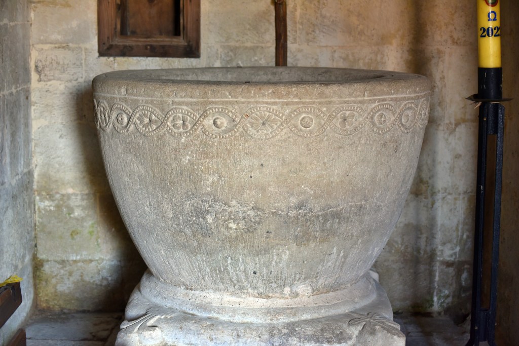 La pila bautismal es románica de forma de cubeta con una cenefa vegetal que remata en una especie de lazo, como nos señala el guía. Antes de irnos, observa que las losas de la iglesia fueron losas sepulcrales, que pueden abrirse mediante una palanca, que nos muestra. Él es uno de los guías que colaboran con el obispado para mantener las iglesias abiertas mediante una pequeña compensación pero sin contrato. En algunos casos se cobra entrada -por lo general, un euro- en otros simplemente se admite un donativo para el templo.