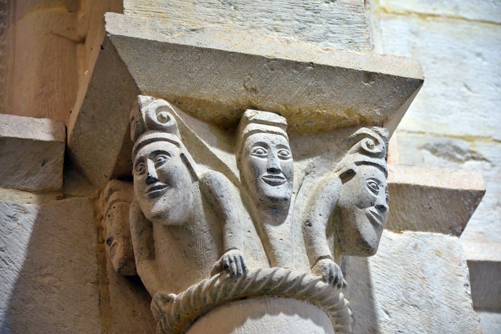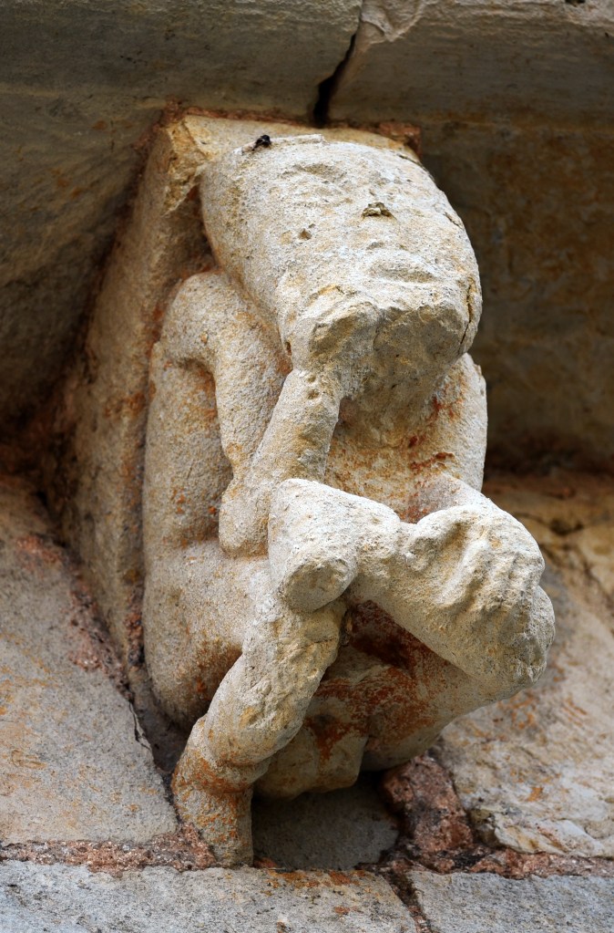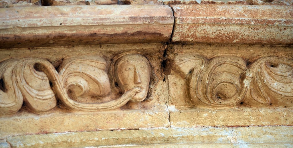 Rodeamos pausadamente los muros de la iglesia, lo que nos permite descubrir los curiosos canecillos que ornan el ábside.