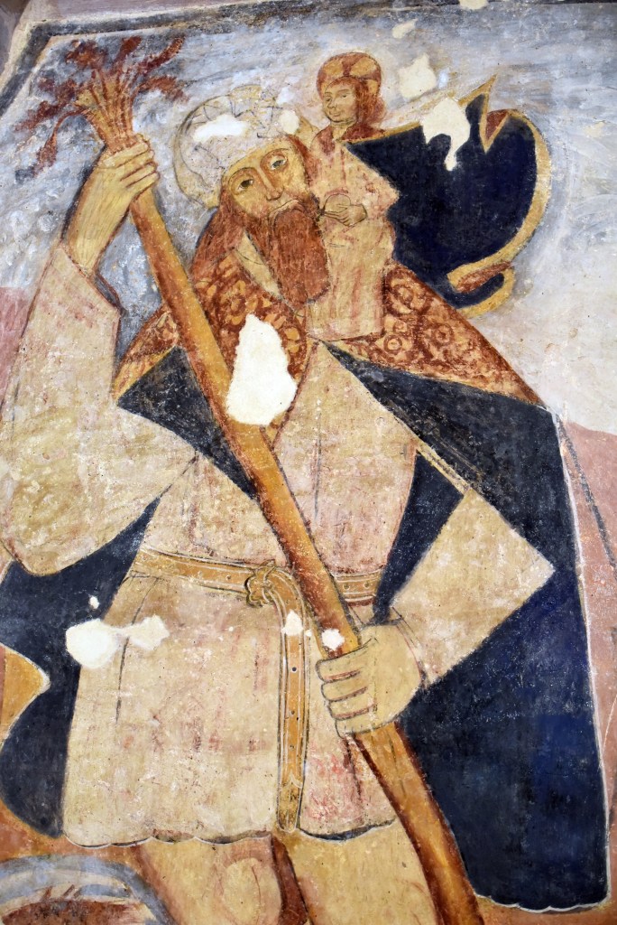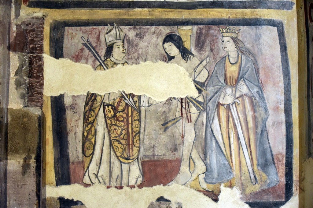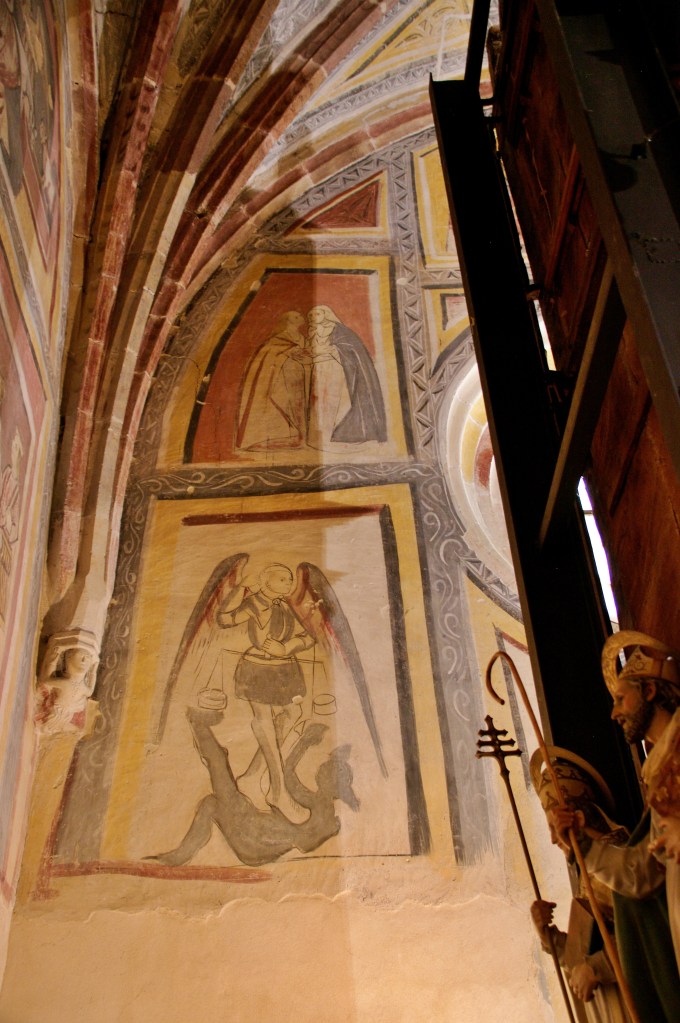 En el muro de la epístola se perdieron algunas pinturas al abrir un óculo para mejorar la iluminación y, al parecer, algunas escenas han sido retocadas. La Visitación, la Huida a Egipto, Santa Bárbara, Santa Catalina y Santa Apolonia y San Miguel son algunas de las escenas aquí representadas.