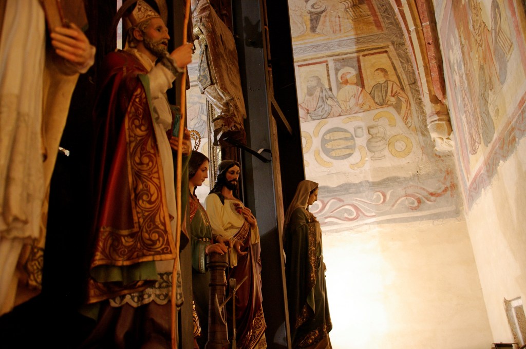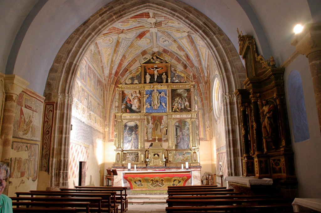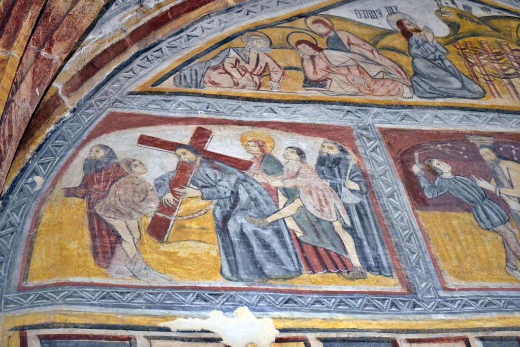Bajo ese pórtico nos recibe Amparo, la guía, y nos invita a entrar. Cuando enciende la luz nos quedamos patidifusos: desde la crucería de la bóveda por sus muros se despliega un colorista cómic religioso. Estas pinturas al temple del siglo XV, ya plenamente góticas, se atribuyen al taller de San Felices, cuyo rastro puede seguirse en la zona que hoy corresponde al norte de Palencia y el sur de Cantabria, conservan cierta influencia románica en su composición; sus personajes son expresivos y didácticos y visten ropajes propios de la época en que se realizaron.