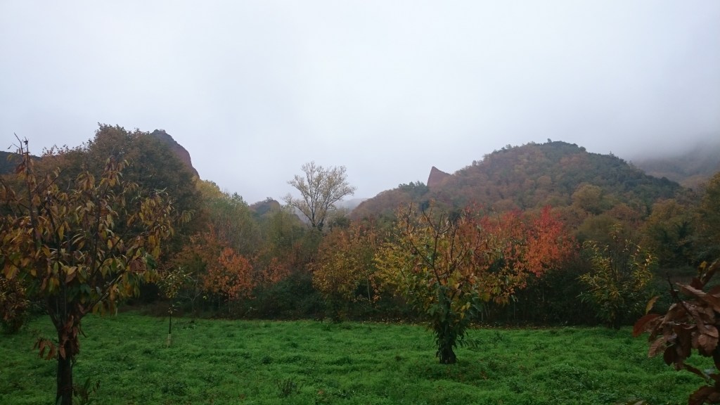 Volvimos en los primeros días de noviembre de 2015, aprovechando el veranillo de San Martín. Partíamos de Madrid y hasta Ponferrada seguimos el trazado de la A-6, sin problema. En ese punto le encomendamos al GPS que nos buscara la mejor ruta y el aparato decidió ponerse creativo. El resultado fue un itinerario por caminos casi intransitables y que llegáramos a Orellán más tarde de lo previsto, cuando ya caía el sol y las siluetas formidables de las Médulas empezaban a convertirse en enormes fantasmas. Como la temperatura era muy agradable, hicimos la ruta entre el pueblo y el mirador -al que ya no se podía ir en coche-, disfrutamos de los olores y colores otoñales y dejamos las fotos para el día siguiente, con sol.