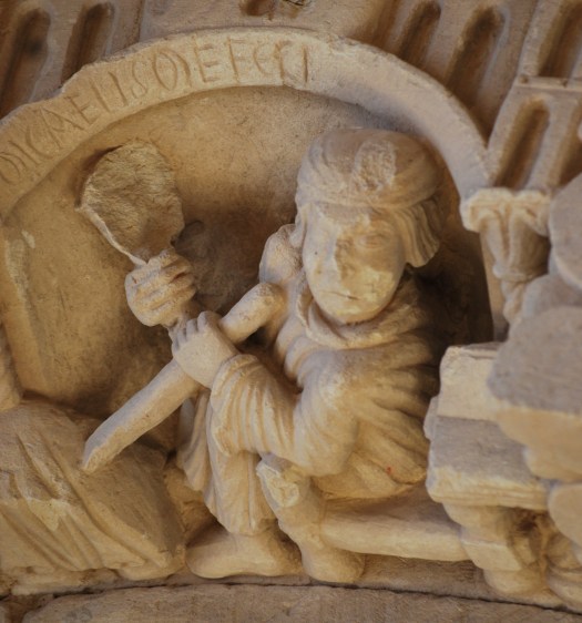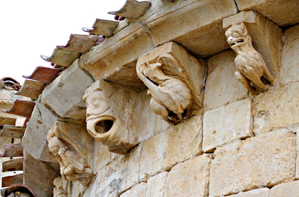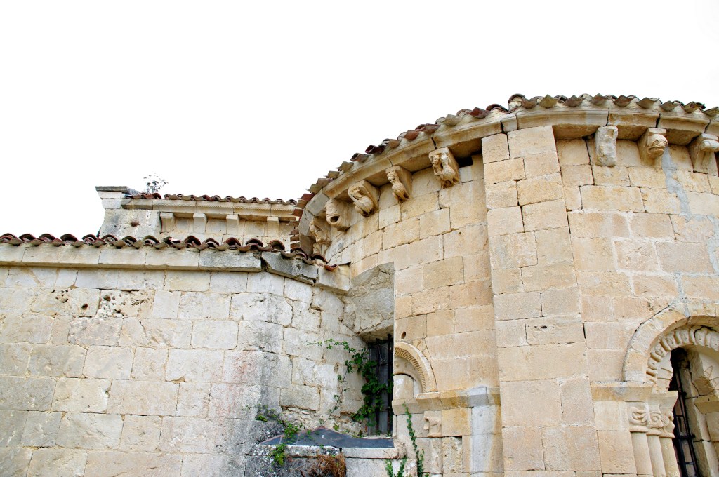 Muy distintos son los canecillos que coronan el ábside: un jinete que somete con su espada a un animal fantástico, arpías, mascarones y, sobre todo, una figura de pensador -en la que bien pudiera haberse retratado el maestro, como el Micaeli de Revilla de Santullán (Palencia)-.