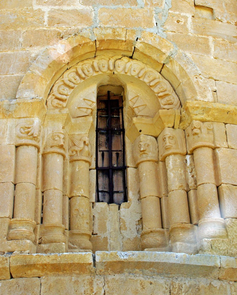 En la ventana del paño central, de medio punto doblado, la rosca interna muestra dientes de sierra y la externa diez cabezas humanas abrazadas por serpientes que forman pequeños arquillos. Los arcos descansan en tres pares de columnas con capiteles que recuerdan los de Siones y San Pantaleón de Losa: una bestia de siete cabezas, dragones, un glutón, mascarones y lo que parece un batracio. Esta ornamentación escultórica -expresionista y algo tosca- parece corresponder a la primera etapa constructiva de la iglesia.