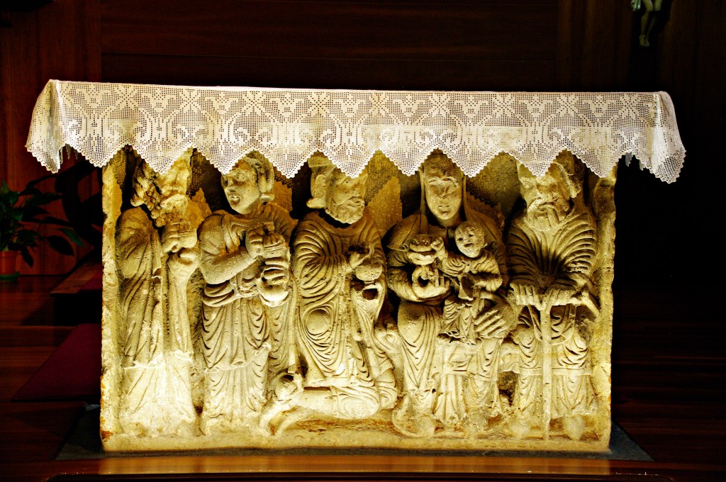 Lo primero que nos encontramos al abrir la puerta fue un relieve del siglo XII, que un día fue frontal de altar, ahora adosado al muro norte: la Adoración de los Reyes Magos, de una rara expresividad. De derecha a izquierda vemos a San José, con aspecto adormilado, la mano apoyada en un cayado; una Virgen coronada sostiene en el regazo al Niño, que tiene un libro en su mano izquierda mientras bendice con la derecha; uno de los Reyes, de rodillas, los otros dos hablan entre ellos, todos portan ciborios con sus ofrendas. En los plácidos rostros de los personajes se aprecian restos de policromía.