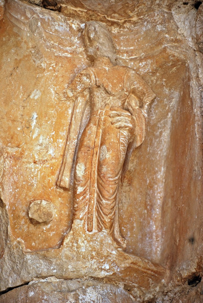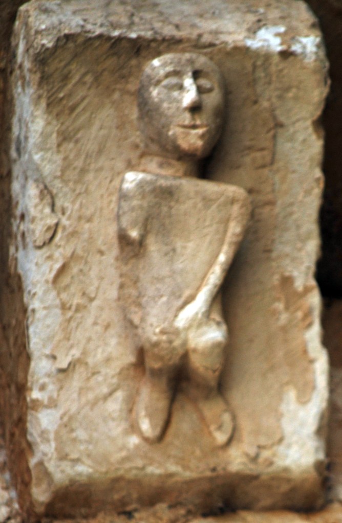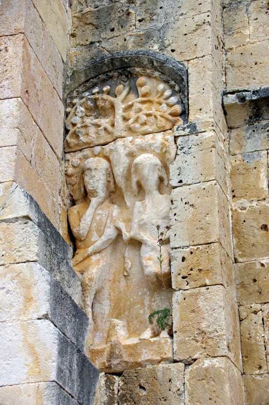 En el muro exterior, se ha incrustado un relieve que representa a Adán y Eva y el Árbol de la Vida, todo él algo deteriorado.
