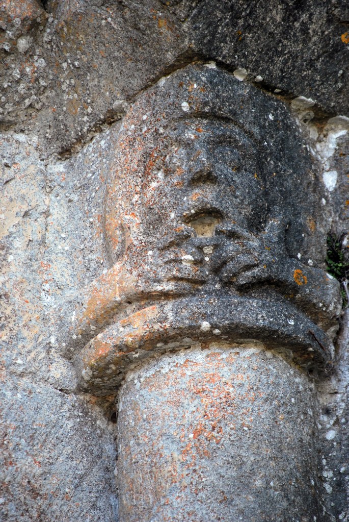 De vuelta al exterior, contemplamos la portada, un arco de tres arquivoltas apuntadas, decoradas con motivos vegetales y puntas de diamante, que se abre en el muro sur, protegida por un pórtico de construcción posterior.