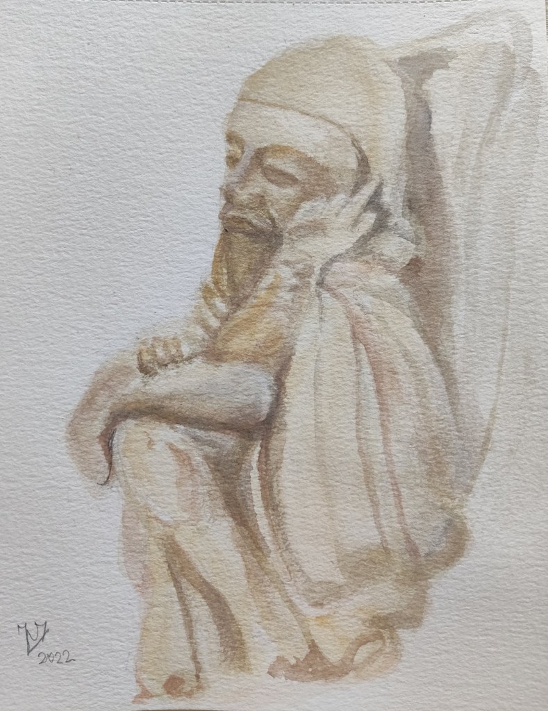 Tan emocionados nos había dejado el gesto de los voluntarios de Butrera que cedían su tiempo de descanso para enseñar su iglesia a los visitantes, incluso tan extemporáneos como nosotros, tanto había denostado a los responsables autonómicos y provinciales que a esas horas estarían de vacaciones o descansando plácidamente, que se nos pasó por alto la figura de nuestro Pensador, que se encuentra algo oculto, sobre el tejadillo de la sacristía.