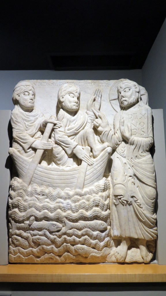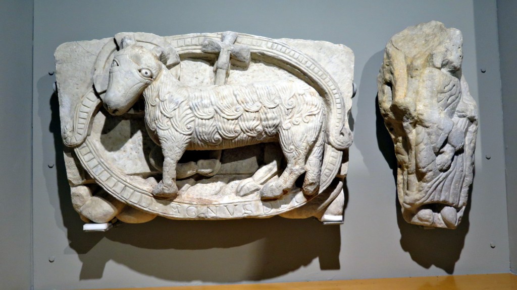 En junio de 2021 visitamos el Museo Marés de Barcelona -que viene a ser como el cementerio del arte español perdido- y allí encontramos dos piezas originarias de San Pedro de Roda debidas al Maestro Cabestany, inconfundibles por sus grandes manos y cabezas, por sus ojos oblicuos, por el movimiento del ropaje y por el uso del trépano. Un fragmento del relieve que representa la curación del hombre de la mano seca y un Agnus Dei, clave de arquivolta de la portada; este último adquirido por la Asociación de los Amigos de los Museos de Cataluña y donado al Marés.