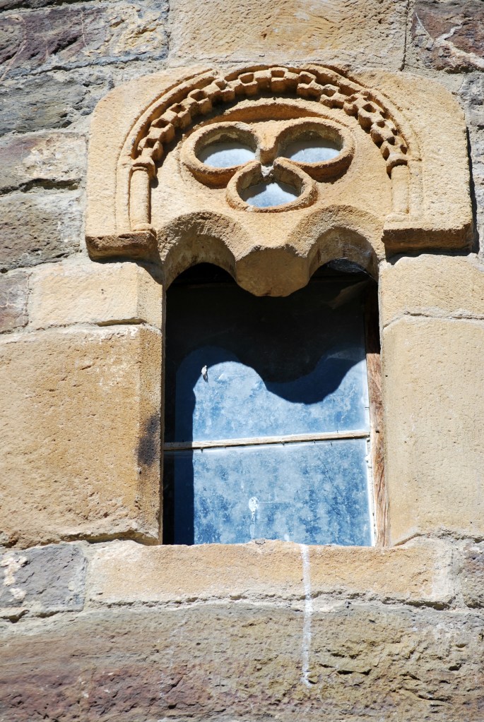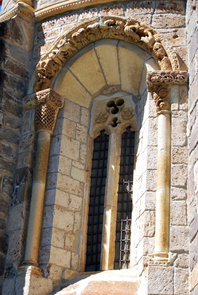 El ábside central está dividido en tres paños por dos gruesos contrafuertes que en la parte superior se convierten de pares de columnas rematadas en capiteles figurados de gran belleza: uno de ellos representa el sacrificio de Isaac, el otro la Anunciación. En el paño central se abre un ventanal con arquivolta que apea en dos columnas rematadas en capiteles.