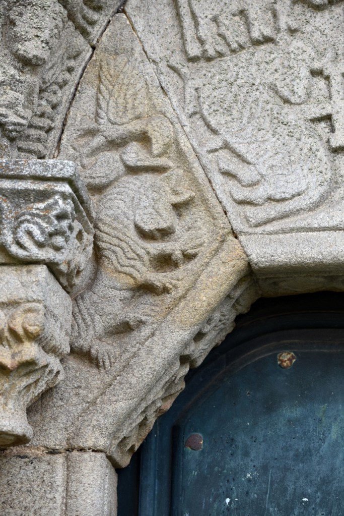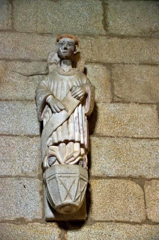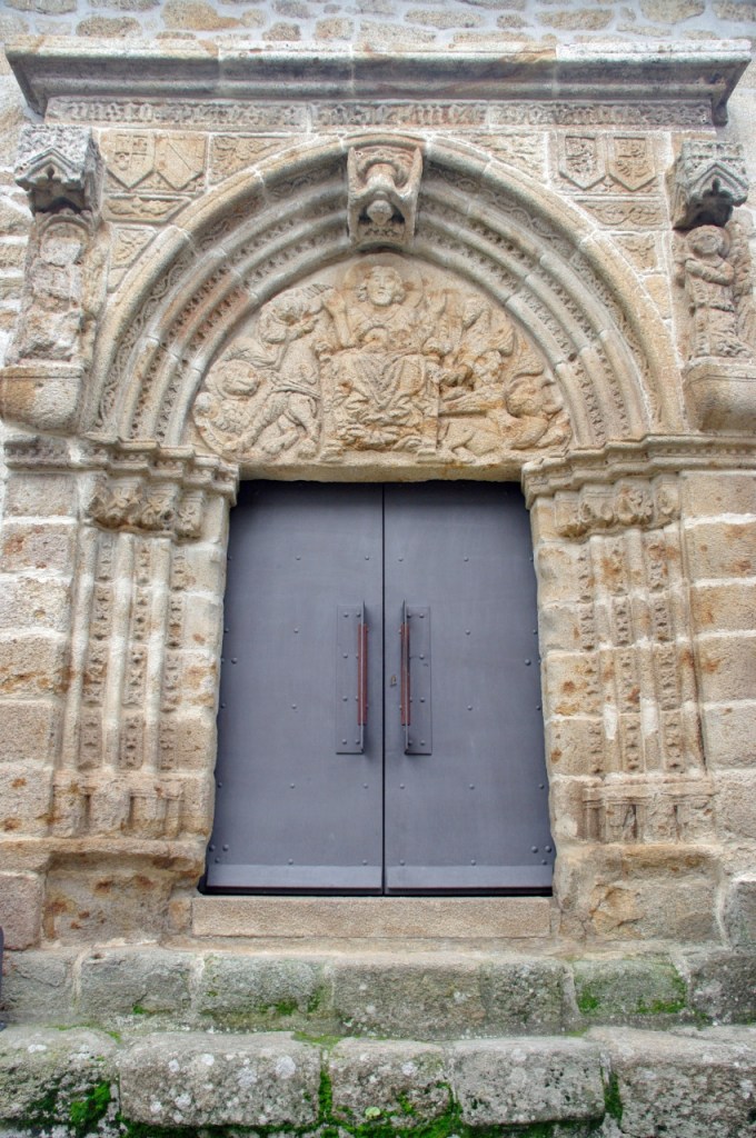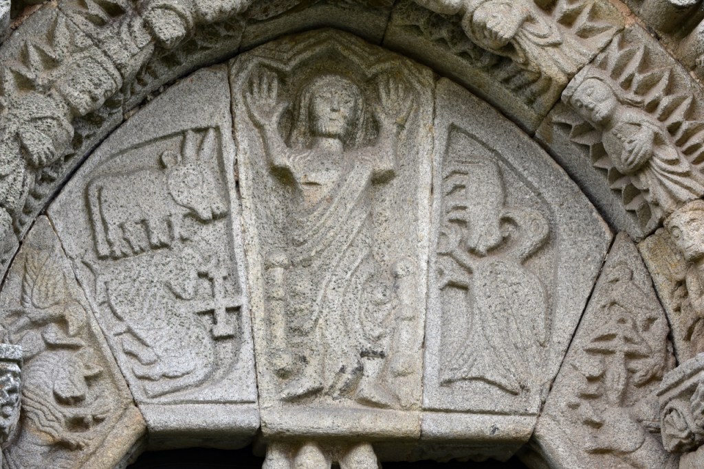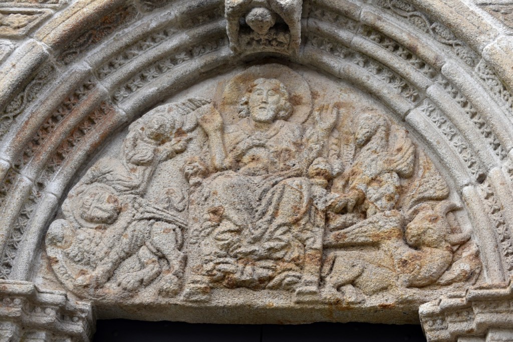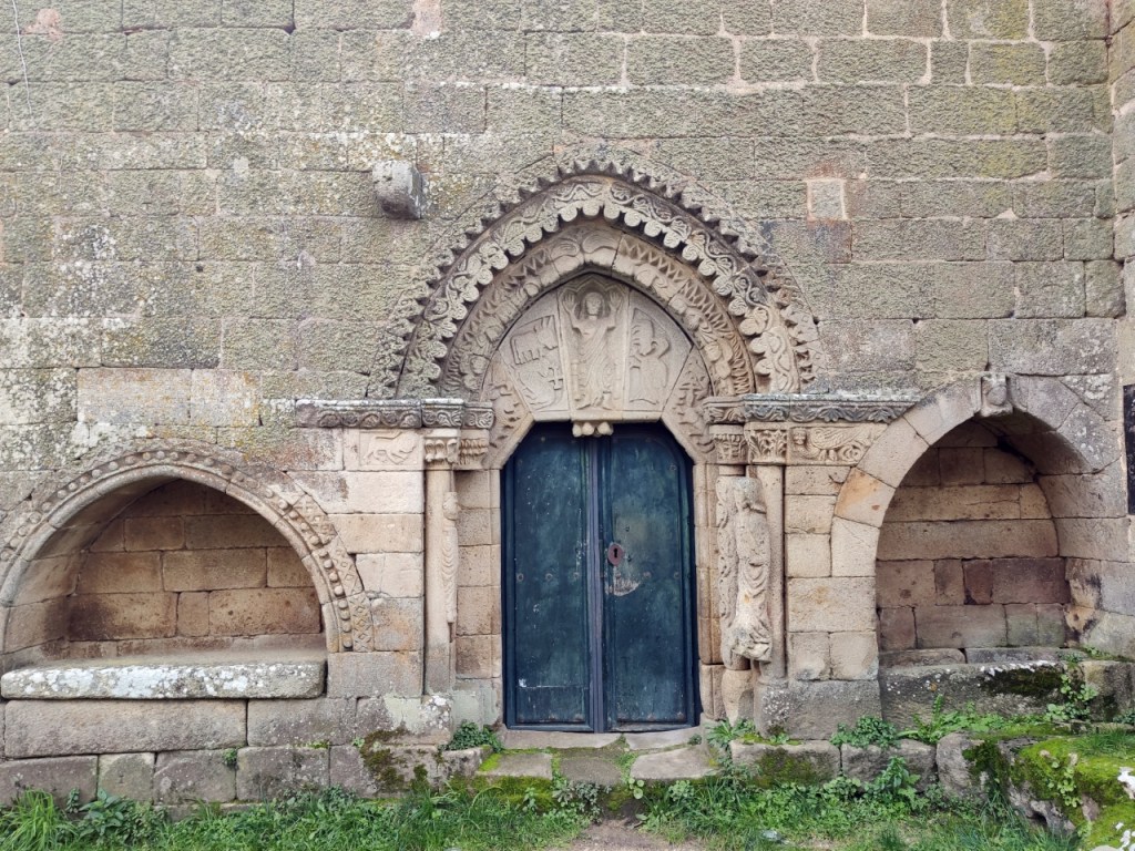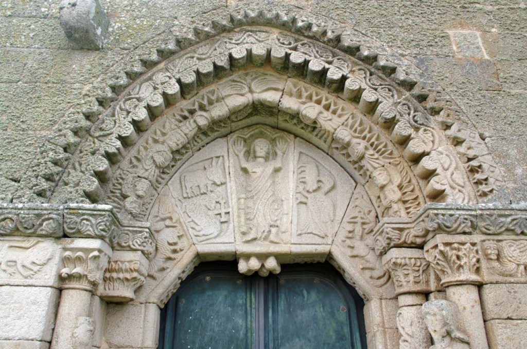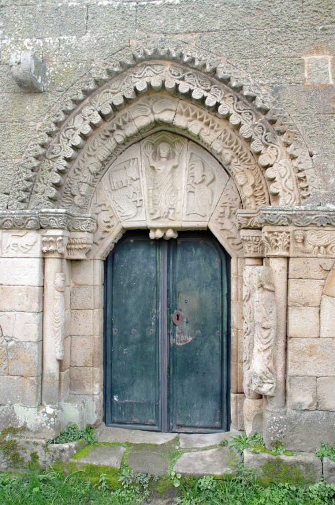 La portada, que mira al patio de armas, es de tipo románico, con arco apuntado orlado por tres arquivoltas decoradas con figuras geométricas las dos exteriores y la interior con una fila de ángeles. Las arquivoltas interiores apean en capitales con formas vegetales, la exterior se apoya sobre jambas con relieves de un león y una arpía. En el tímpano, un Cristo rodeado de un buey, un ave que picotea a otro animal y un Agnus Dei, en lo que se interpreta como una peculiar versión del tetramorfos. Puede que al maestro le faltaran referentes o que se pusiera creativo, pues realmente no hay espacio de esta puerta que no aprovechara para dejar muestra de su inspiración.