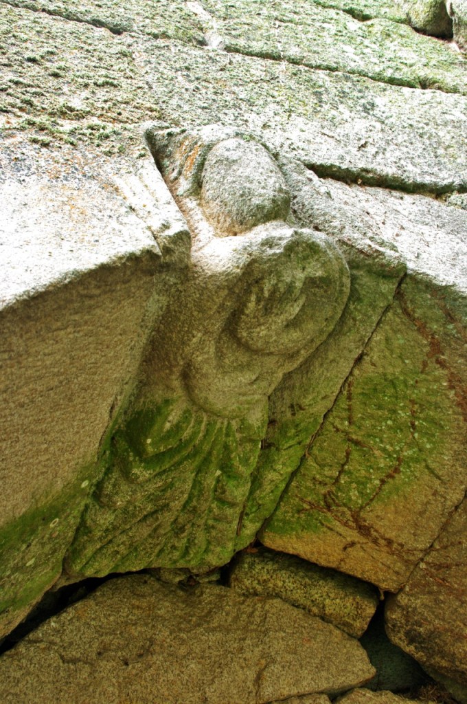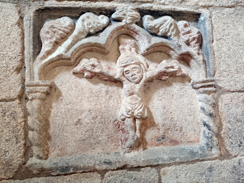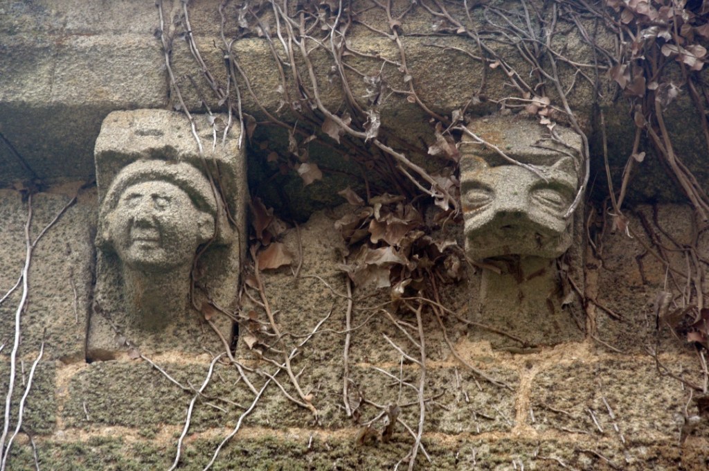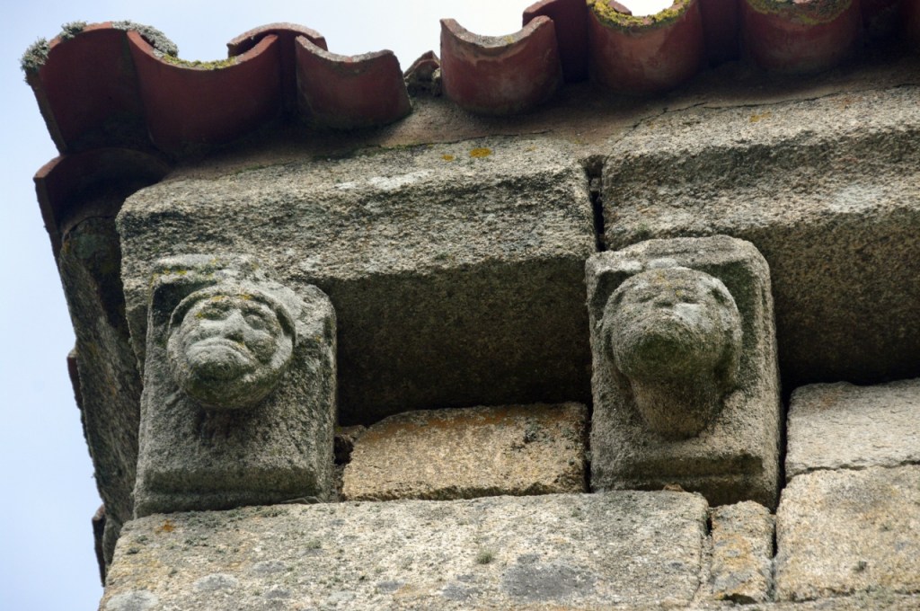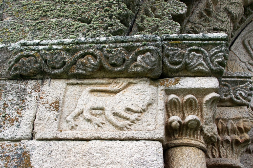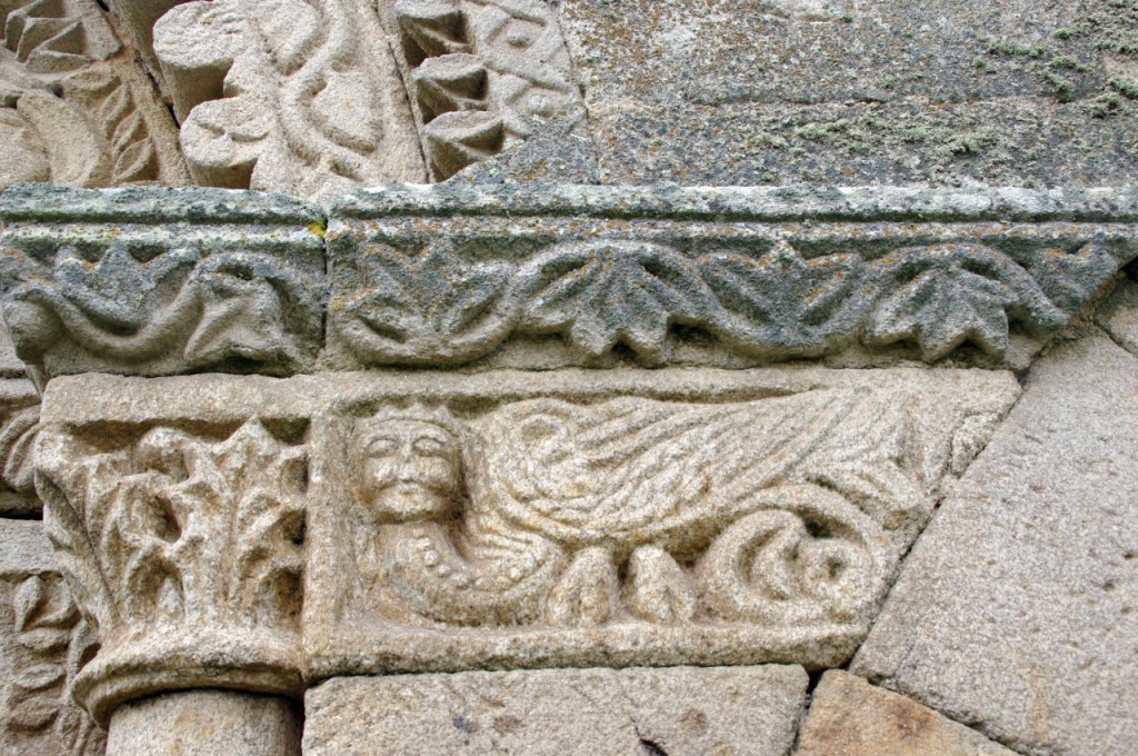 A lo largo de los muros de la iglesia una amplia colección de canecillos geométricos y figurados, entre los que destacan cabezas de animales, una pareja mostrando sus genitales -demostración quizá del poder del linaje de la familia protectora- y un hombre defecando. Algunos de ellos están sepultados por un denso ramaje que, aparte de ocultarlos, amenaza su integridad.