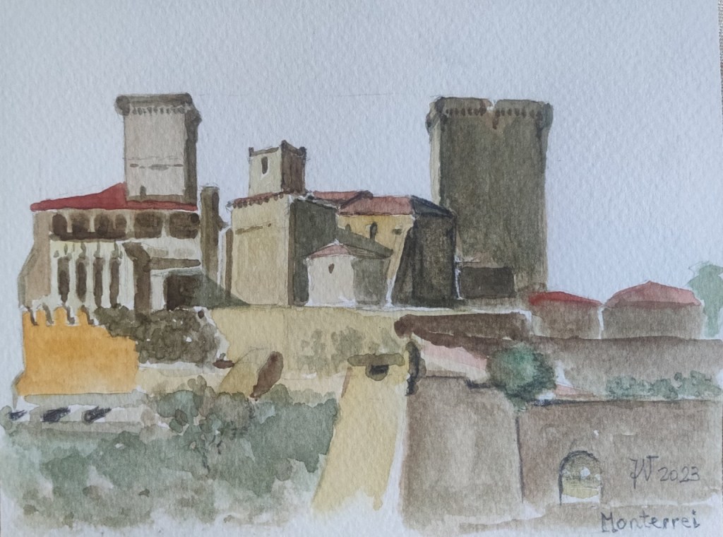 Pero el dios de los viajeros, sea el griego Hermes o el nórdico Odin, tenía otros planes para nosotros. En el camino a la gasolinera descubrimos un castillo en lo alto del montículo que domina la ciudad. Un indicador señala que se trata del castillo de Monterrey y allá que nos vamos. Aún no nos hemos repuesto de la sorpresa ni del encantamiento.
