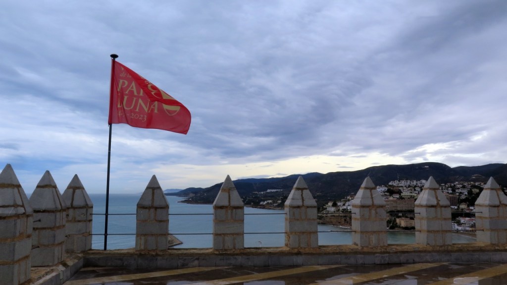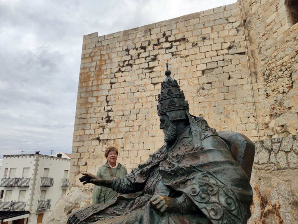 A la hora que llegamos el Castillo ya ha cerrado. El Papa Luna, en cambio, permanece inmutable en su trono, atendiendo las cuitas de quien le visita. La escultura de bronce -de dos metros de altura y 700 kilos de peso- es una más que digna obra de Sergio Blanco -el cantante del dúo Sergio y Estíbaliz- instalada en noviembre de 2007. El lugar evoca la frase evangélica de tú eres Pedro y sobre esta piedra edificaré mi iglesia.