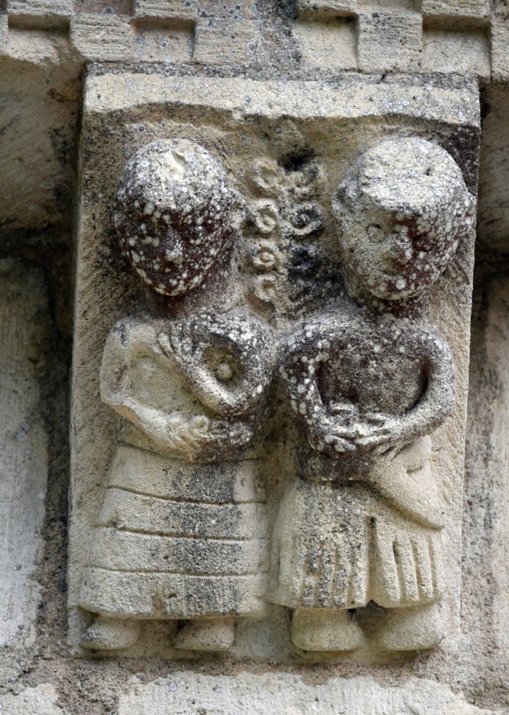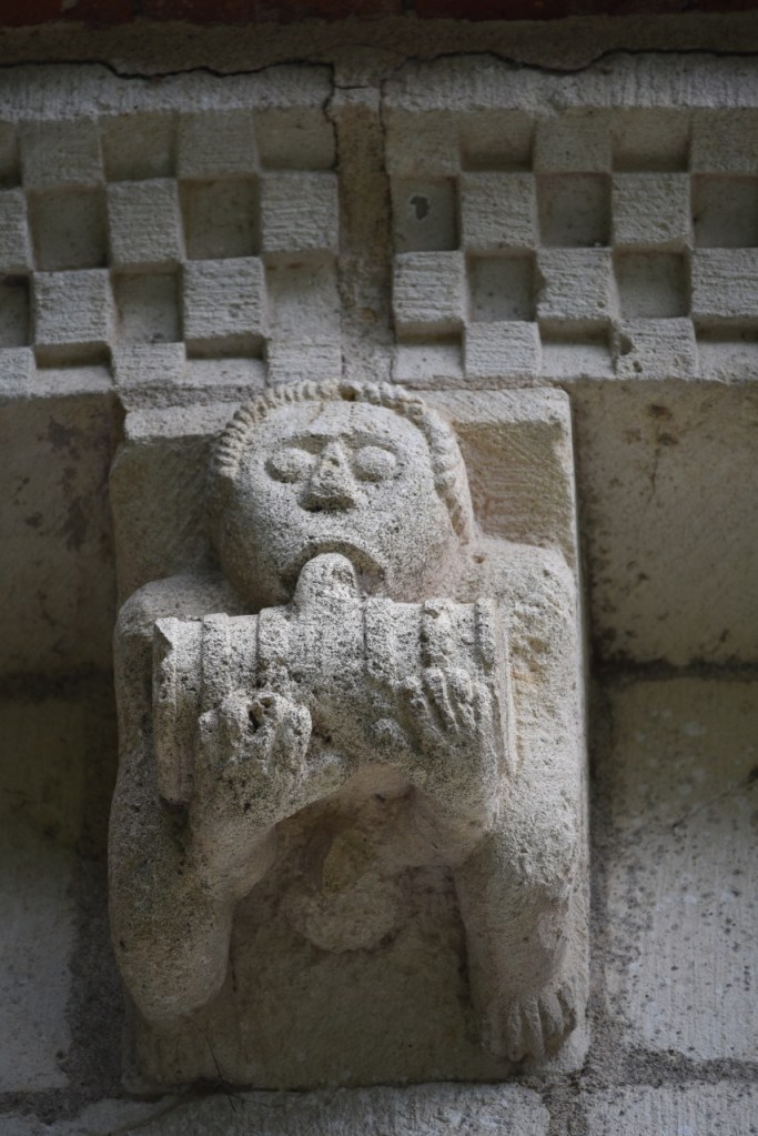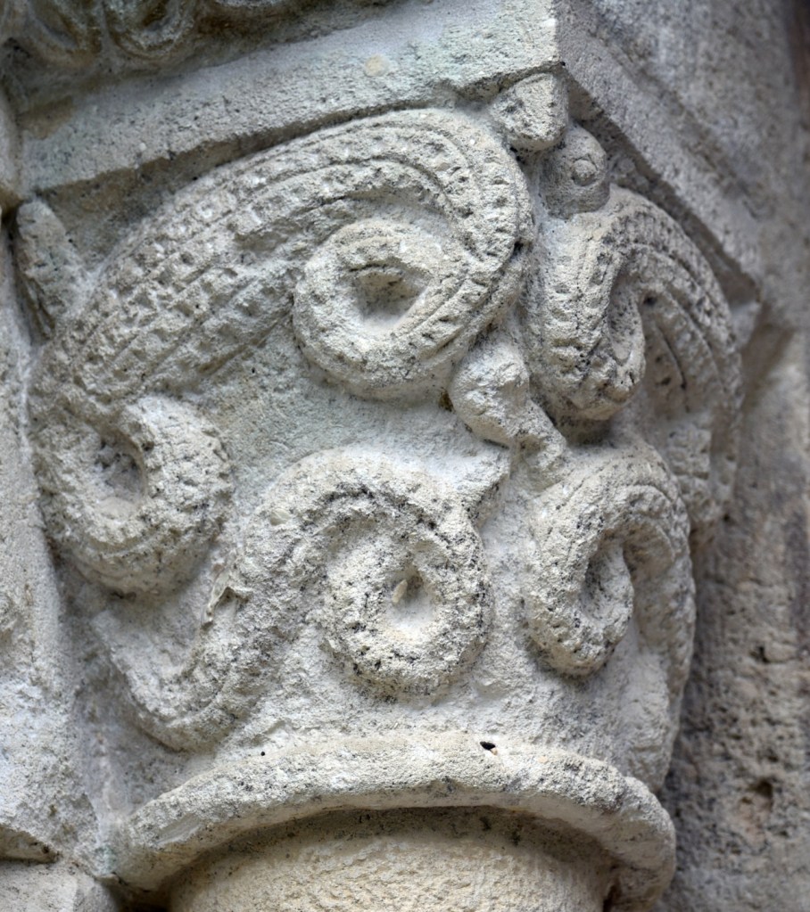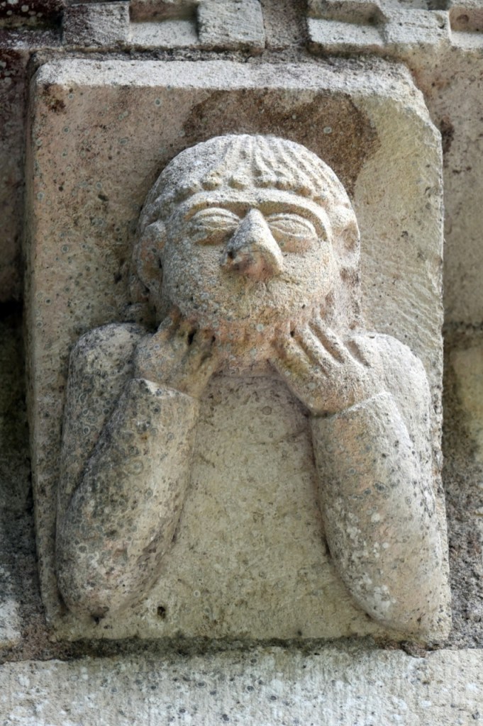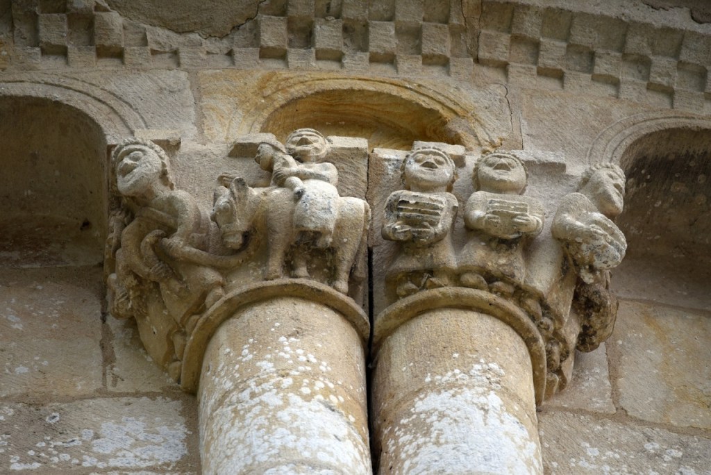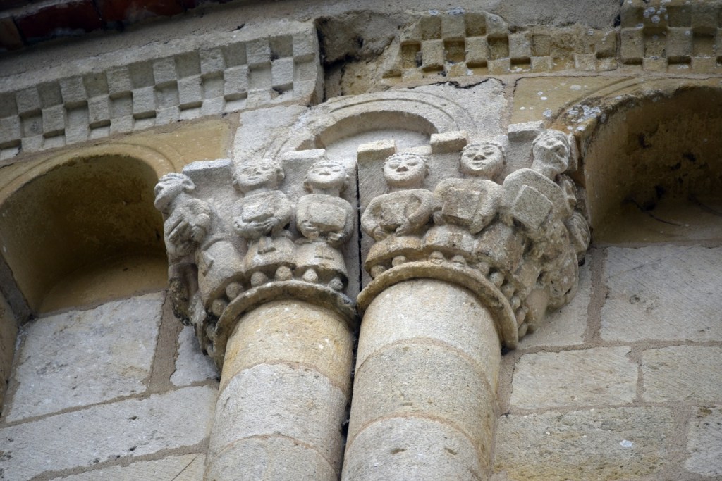 Nos conformamos con contemplar el exterior de la iglesia, que no es poco. Esta cabecera triabsidal que contemplamos es la parte más antigua de la fábrica, levantada entre los siglos XII y XIII. Sus 59 modillones y nueve capiteles, figurados la mayoría y en buen estado, son extraordinarios. Se distinguen claramente entre ellos dos mujeres con serpientes, Adán y Eva, la serpiente y el árbol de la vida distribuidos en sendos canecillos, la huida a Egipto, un músico con dolio y otro con fídfula, hombres desnudos y animales diversos. Los escultores quisieron rendir homenaje a los monjes de la abadía retratándolos portando piedras, se supone que para la construcción, y con instrumentos de culto.