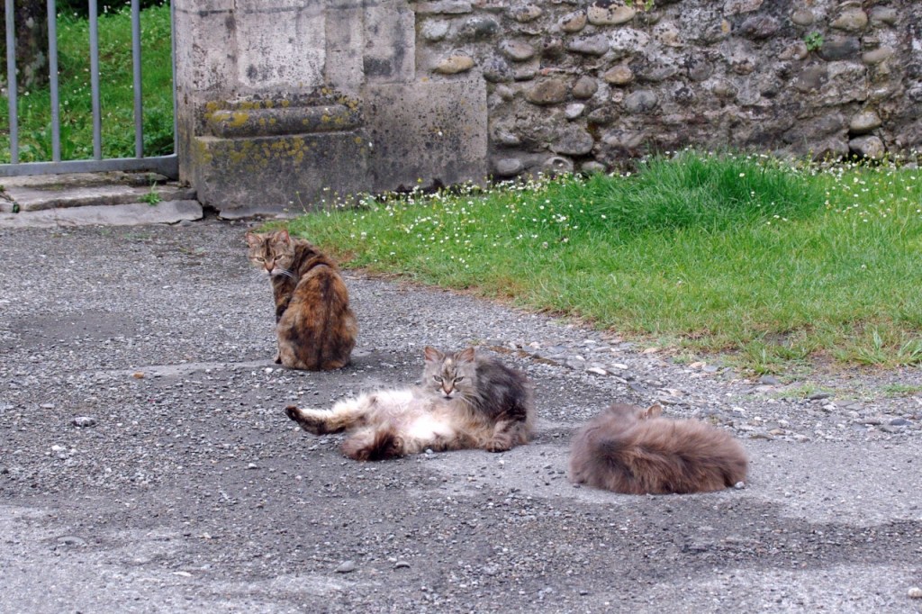 Tras recorrer la iglesia y sus alrededores, optamos por dar un paseo por el pueblo y, si fuera posible, tomar una tabla de quesos con un vino. No solo no encontramos ningún establecimiento abierto, tampoco nos cruzamos con nadie. La única muestra de que no estábamos en un pueblo fantasma es que junto a muchas de las casas había vehículos aparcados y tres gatos despatarrados en la acera.