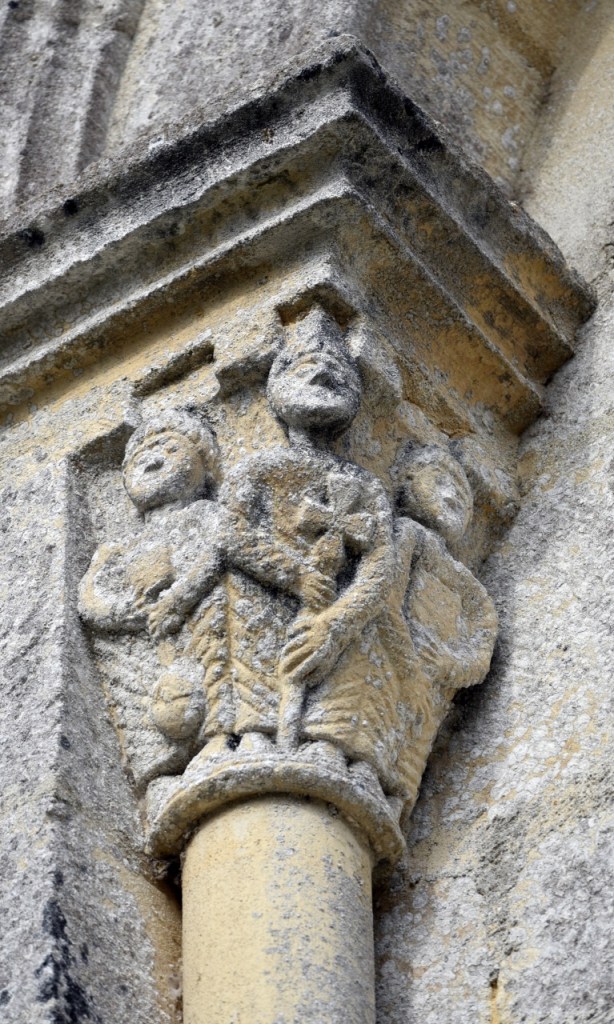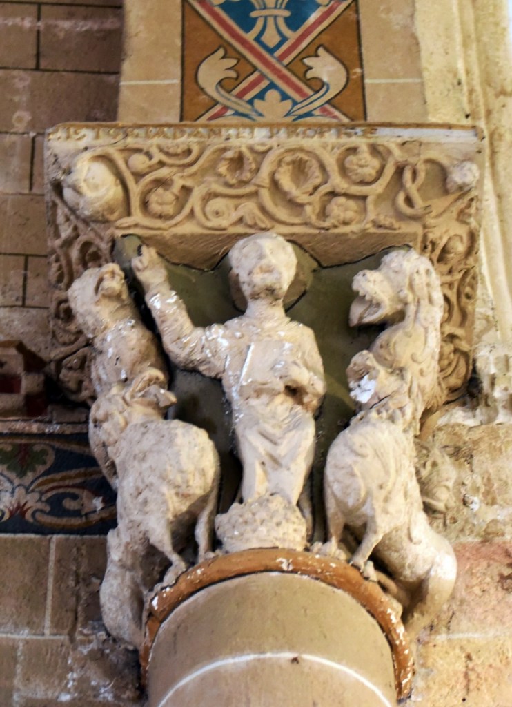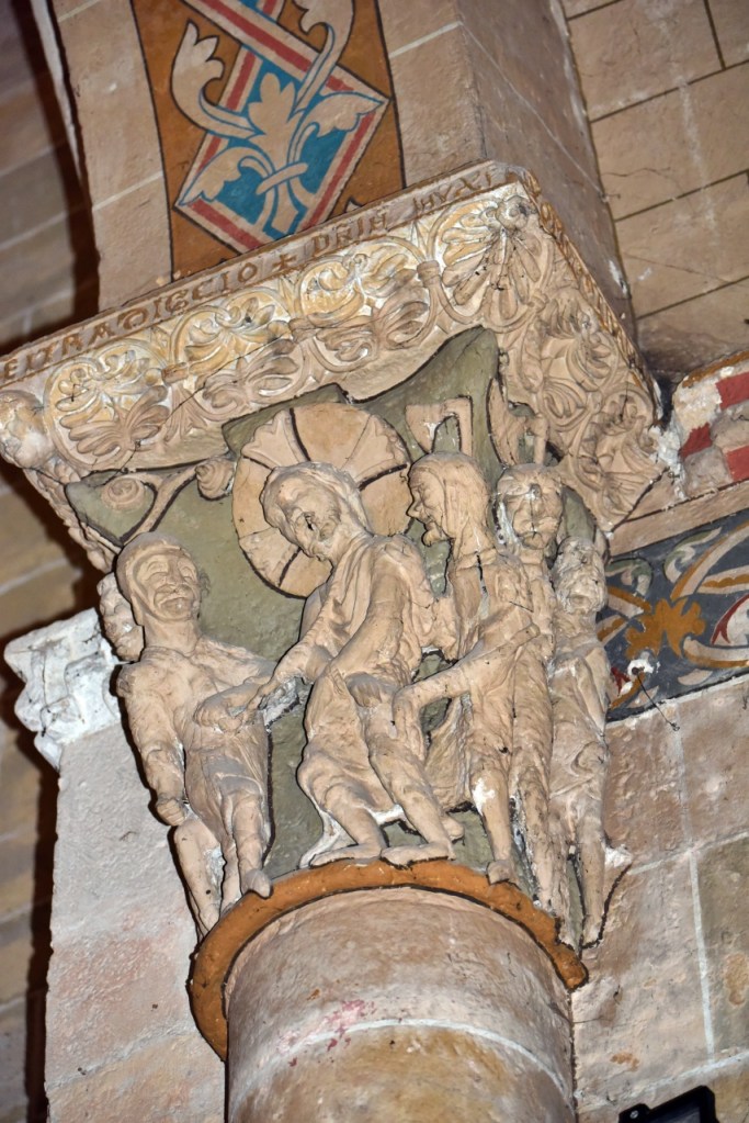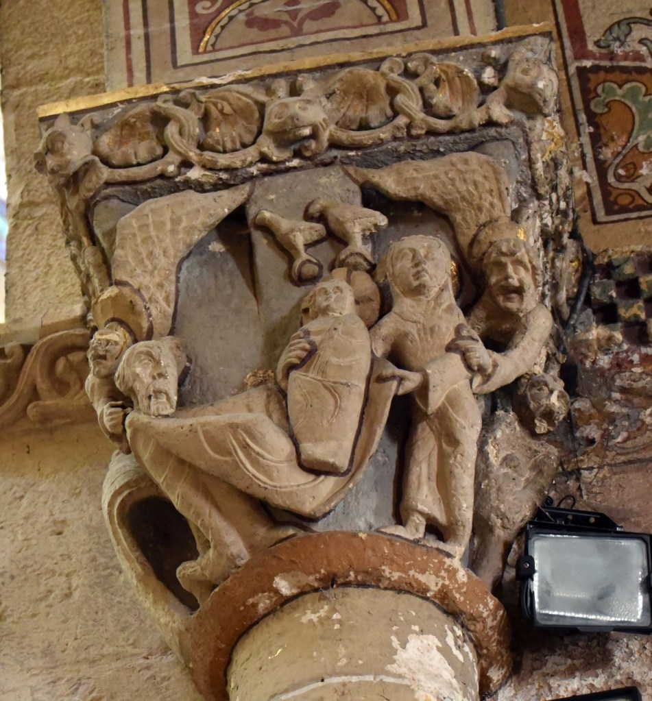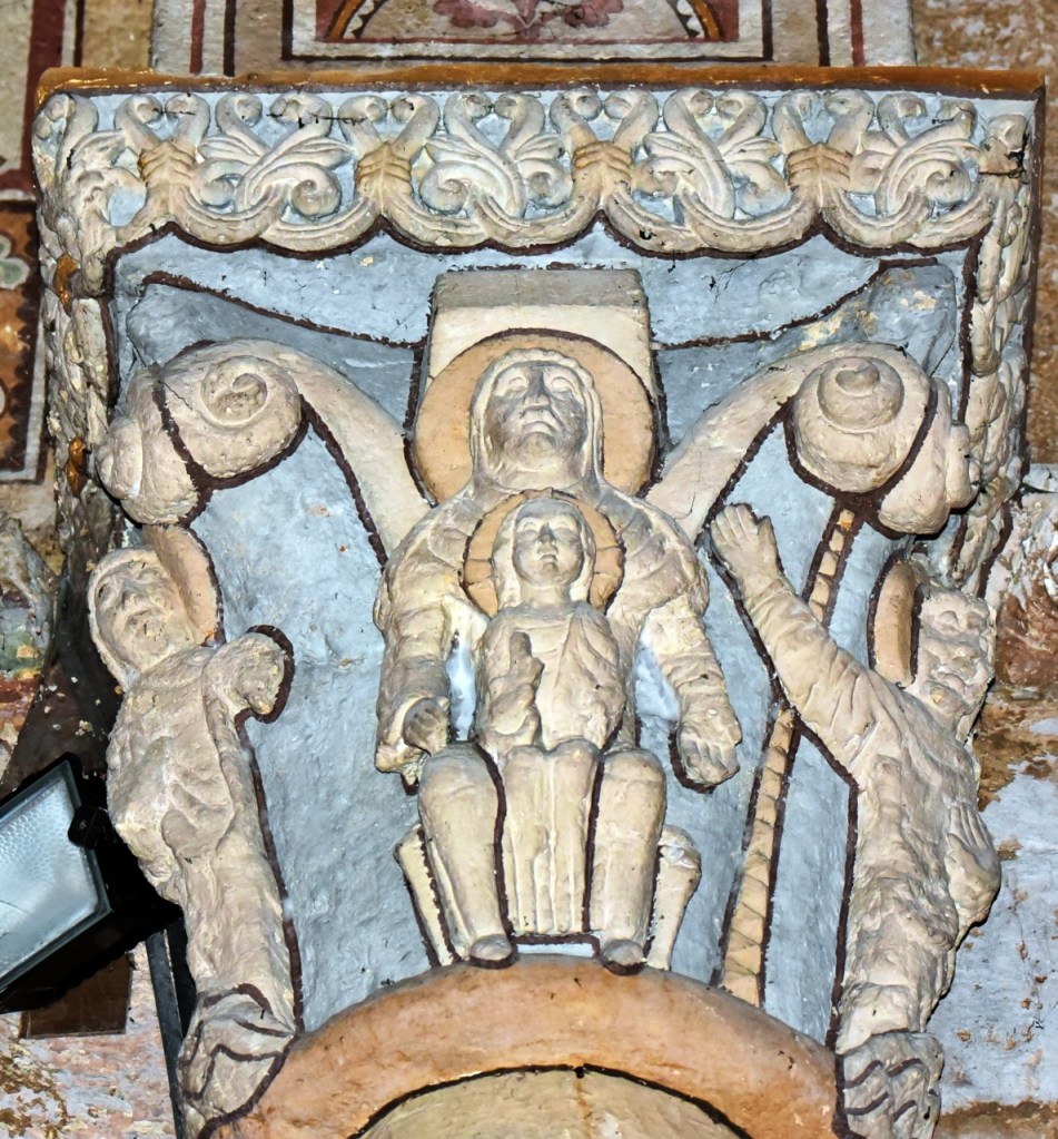 Los capiteles de la cabecera muestran a Daniel en el foso de los leones, la presentación de Jesús en el templo ante el anciano Simeón, el prendimiento de Jesus, atado con sogas en el cuello y las manos y la Virgen María con el Niño rodeados por dos ángeles, en la representación que se conoce como Trono de la Sabiduría.