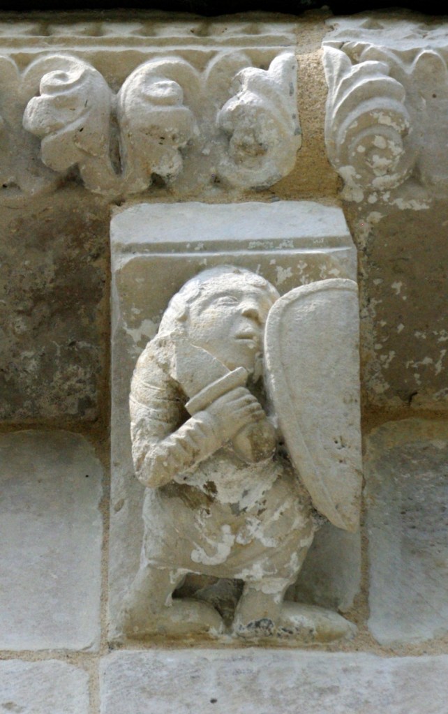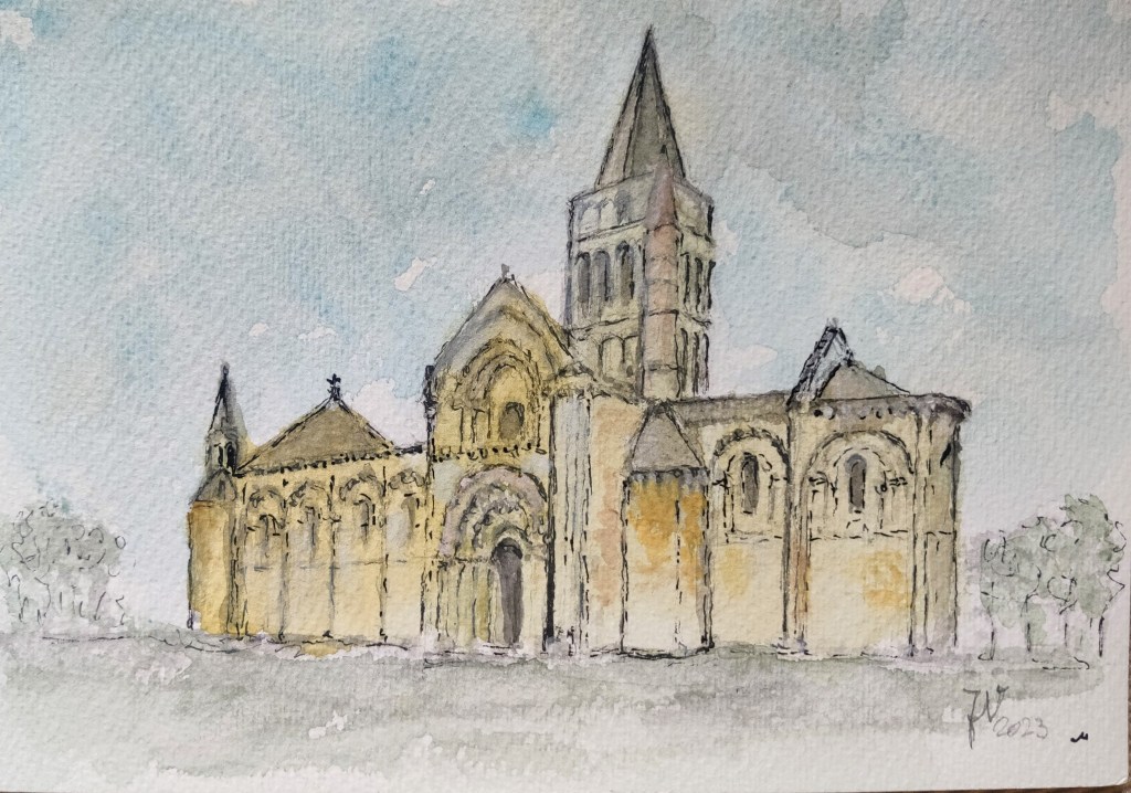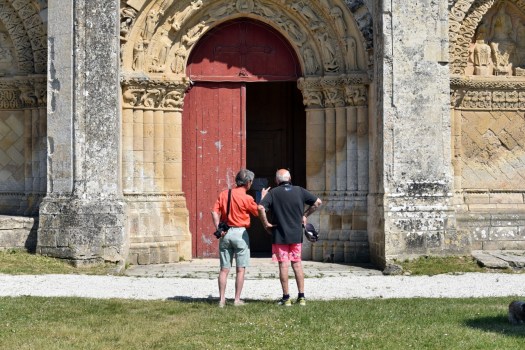 La fachada oeste en ese momento recibe el sol da plano. Me apoyo en una de las tumbas antiguas para saborear esta imagen y grabarla en mi memoria. Es una fachada típica del estilo poitevino, flanqueada por dos linternas con una portada central intensamente decorada. La piedra blanca refulge, iluminada por la fuerza del sol a esa hora.
