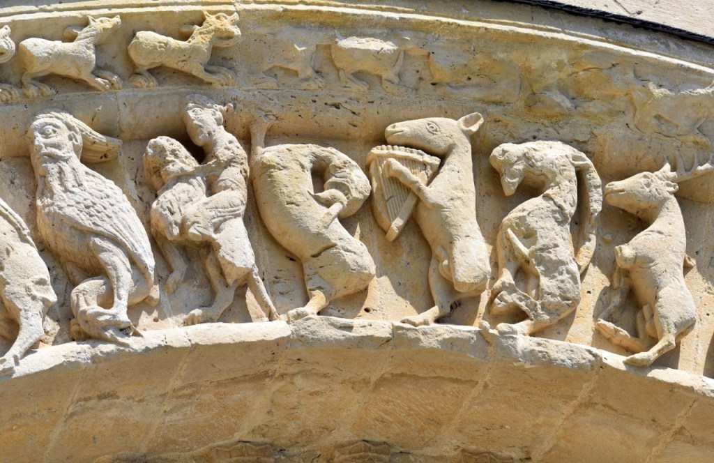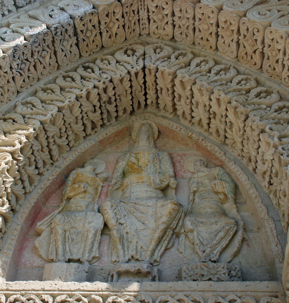 La portada sur se abre en el brazo del crucero con cuatro arquivoltas muy decoradas. En la exterior se distingue un abundante bestiario. En la siguiente se despliegan 31 ancianos -incluidos los 24 del Apocalipsis- tañendo instrumentos musicales. En la tercera, 24 personajes portan libros y frascos de ungüentos; se identifican con los apóstoles y los profetas. En la arquivolta inferior, seis series teriomóficas -figuras de animales con anatomía parcialmente humana o representación humana parcialmente animal-.