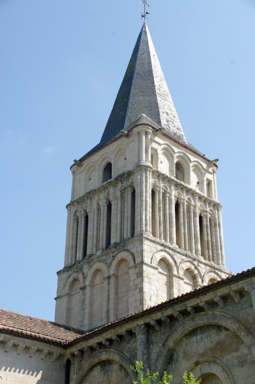 Queriendo aprovechar el tiempo, llegamos a la colegiata de San Pedro en Aulnay de Saintonge a primera hora de la tarde de un día soleado, que no es el mejor momento para conseguir buenas fotos. En cualquier caso, no hay cámara capaz de captar el encanto de este edificio, ubicado actualmente en las afueras del pueblo, junto a un cementerio merovingio, rodeado de jardines y arbolado. Fue mandado edificar por los canónigos de Poitiers entre los años 1130 y 1150. Verdaderamente, se esmeraron.