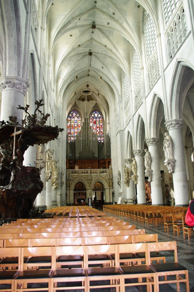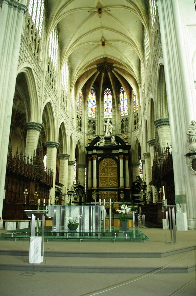 El interior de la catedral es igualmente gótico con el altar y el coro barrocos. La impresión es de grandiosidad, mide 118 metros de largo. En Malinas y en casi todas las iglesias flamencas que visitamos encontramos púlpitos barrocos, generalmente tallados en madera y muy decorados, quizá herencia de la Reforma.