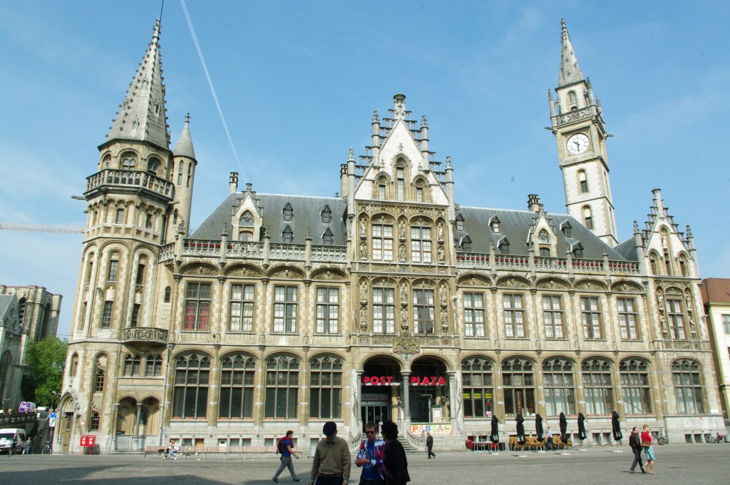 La plaza principal de Gante es la Korenmarkt, que significa la plaza del grano, pues aquí se comerciaba el trigo y maíz que llegaba al puerto fluvial. A este lugar se abre la oficina de Correos, edificio señorial mezcla de gótico y renacentista.