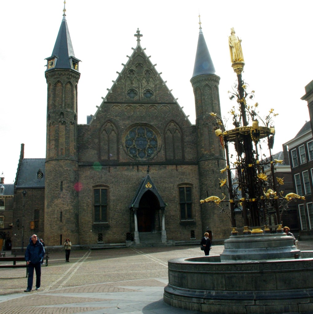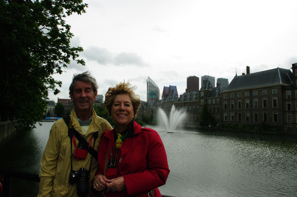 La Haya, capital administrativa del país, nos recibió con un cielo nuboso y triste y una lluvia mansa. Nos alojamos en un hotel junto al nuevo ayuntamiento, que refleja el carácter holandés: en él se mezclan las dependencias administrativas con galerías comerciales. A la mañana siguiente paseamos hasta el Binnenhof o Estados Generales, institución que agrupa el Congreso y el Senado, heredera de la asamblea de representantes -nobleza, clero y burguesía- creado por los duques borgoñones en el siglo XV. Nos fotografiamos ante ella.