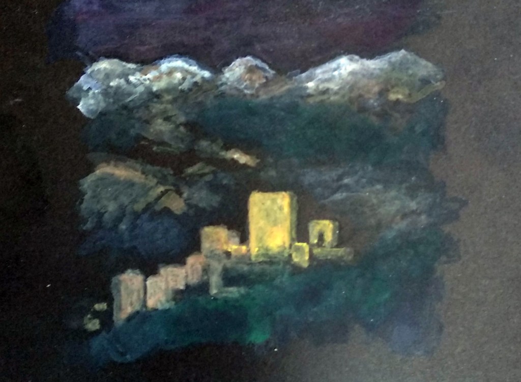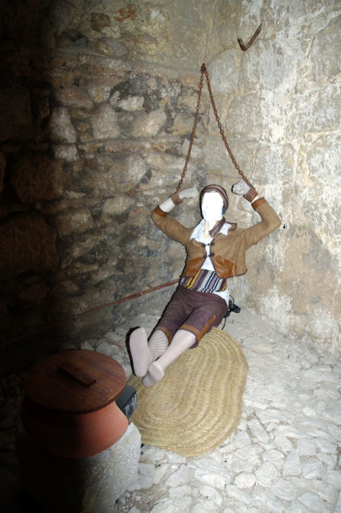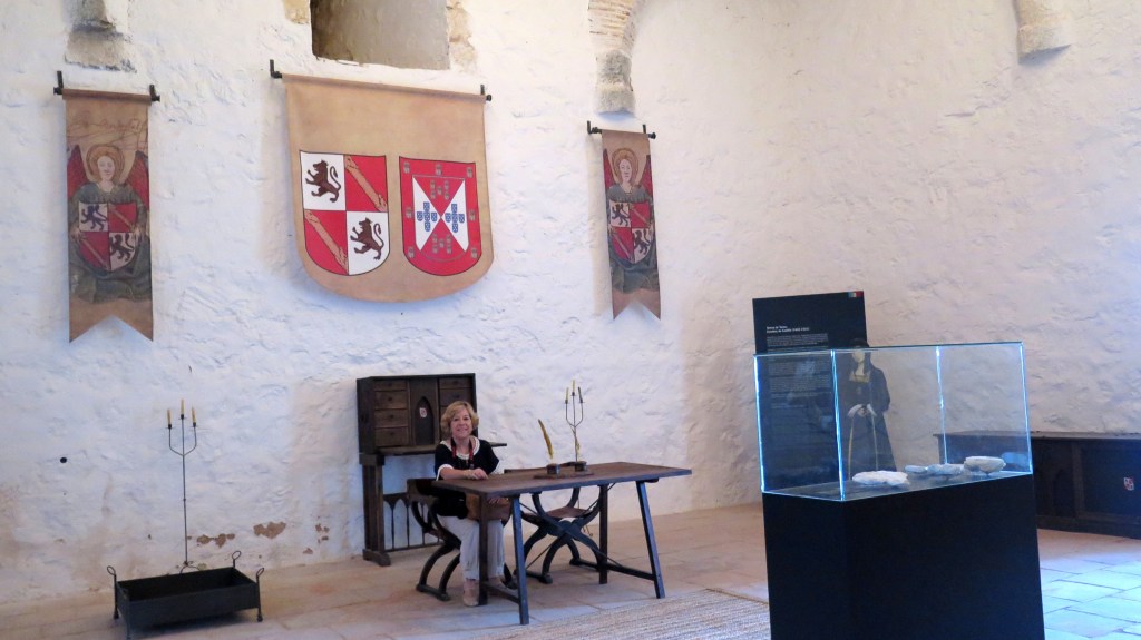 Siguiendo las indicaciones del itinerario llegamos a la Torre del Homenaje donde hay dispuesta una sala de proyecciones que, en esos momentos, acaba de terminar el pase. Aprovechamos el tiempo de espera hasta el siguiente pase para recorrer los pisos superiores, solos, sin otra compañía que los soldados de atrezzo, por esta vez mudos. Tonteamos un poco en las salas, nos fotografiamos en la mesa, el Colega toma una espada, hacemos, en fin, esas cosas que no deben hacerse. Lo hacemos con cuidado, eso sí. Y nos aprestamos a volver a la planta baja cuando una voz nos paraliza: Sé dónde estáis, dice, tronitonante, el espíritu del castillo. Descendemos compungidos, suponiendo que la tecnología ultramoderna del lugar nos ha delatado y nos vamos a ganar una reprimenda como dos escolares, cuando la voz sigue su relato: Estáis en el castillo de Santa Catalina. Es la proyección, que se ha reiniciado.