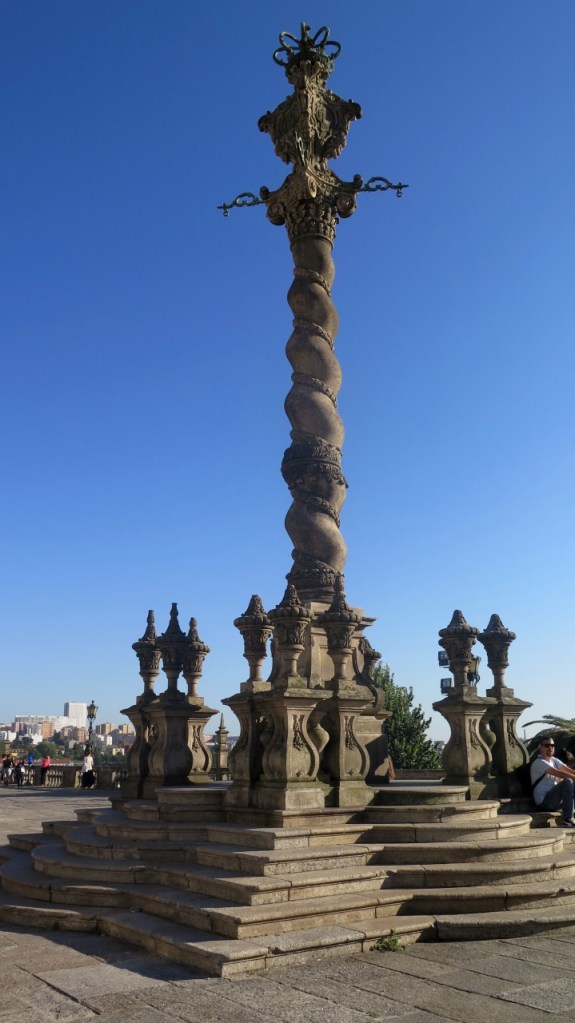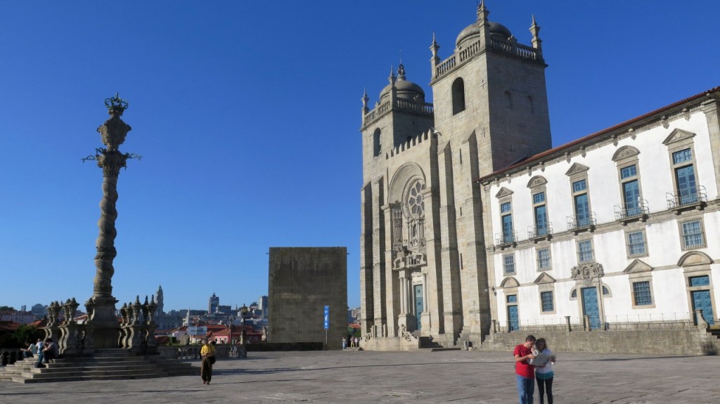 La portada se abre a una amplia explanada en cuyo centro hay un humilladero barroco. A un costado de la plaza se levanta el palacio episcopal, una mole en el perfil urbano portuense. Desde la baranda de la plazuela se contemplan bellas panorámicas de la ciudad. De ahí parte una escalera que acaba en la Ribeira pero nosotros veníamos muy castigados por las escaleras de Braga y optamos por pasear en la dirección contraria, hacia la estación de Sao Bento. Antes, pasamos por la Oficina de Turismo, bien pertrechada de información en el idioma que se demande.