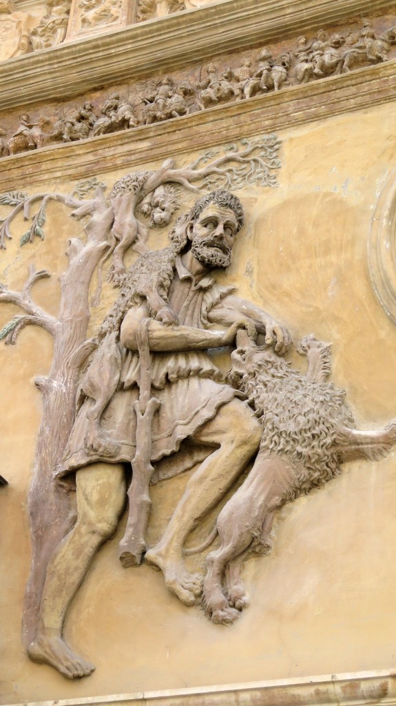 La catedral es el principal de los monumentos religiosos pero no su primer atractivo. Nos encaminamos por la calle Visconti hacia la Plaza de España, donde, sobre la muralla, se levanta el Ayuntamiento, una construcción monumental del siglo XVI, proyectada como lonja y granero. En su fachada hay una profusión de escudos, la figura alegórica de Hércules y un friso que representa el desfile triunfal de Carlos V en su coronación en Bolonia.