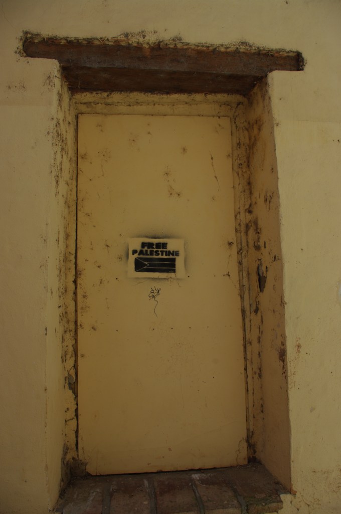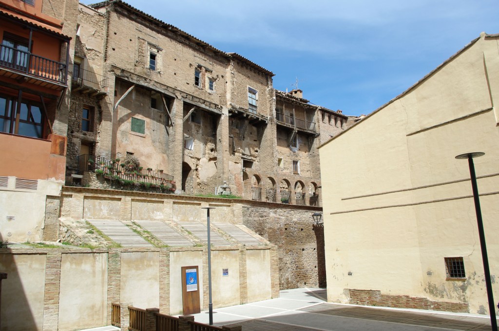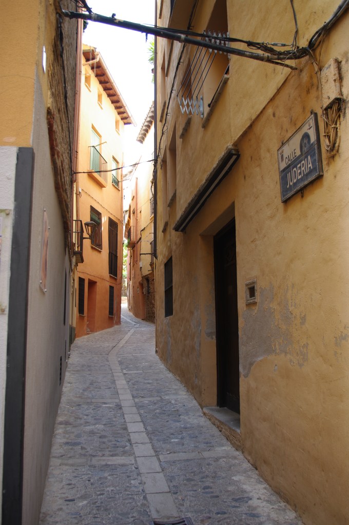 Desde la plaza nos internamos en la judería como si avanzáramos por un túnel en el tiempo y el espacio. Las casas colgantes de Tarazona se asoman al barrio judío. Son edificaciones construidas en vertical para aprovechar el escaso espacio disponible, que recuerdan a otras juderías, como los guetos de Venecia o de Praga. También, como hemos visto en Israel pero en sentido contrario, allí ahora el gueto es palestino. No podemos evitar un escalofrío cuando descubrimos en una de las paredes de la judería una pequeña pintada que reclama: Free Palestine (Palestina libre).