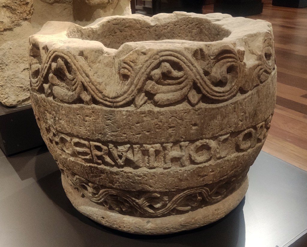 O las pilas bautismales de Mazariegos (Burgos), hecha por Petrus, como reza en el borde (izquierda), o la de San Pedro de Villanueva (Asturias) que recuerda que los comitentes: «Juan y María hicieron esta obra en la Era 1152) (foto derecha).