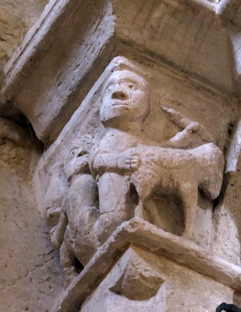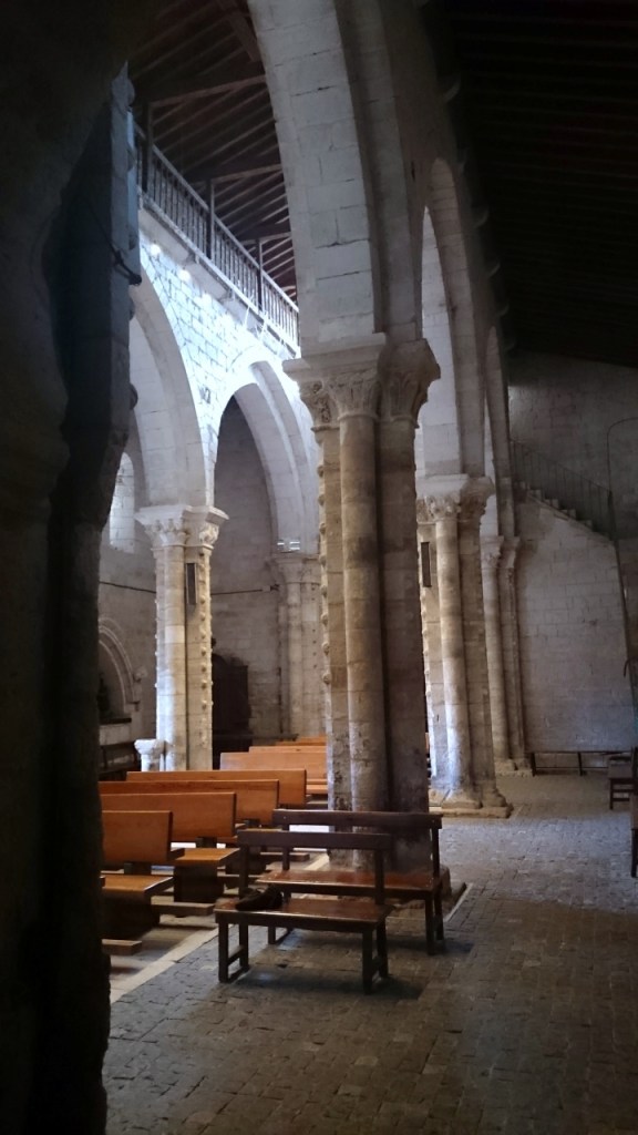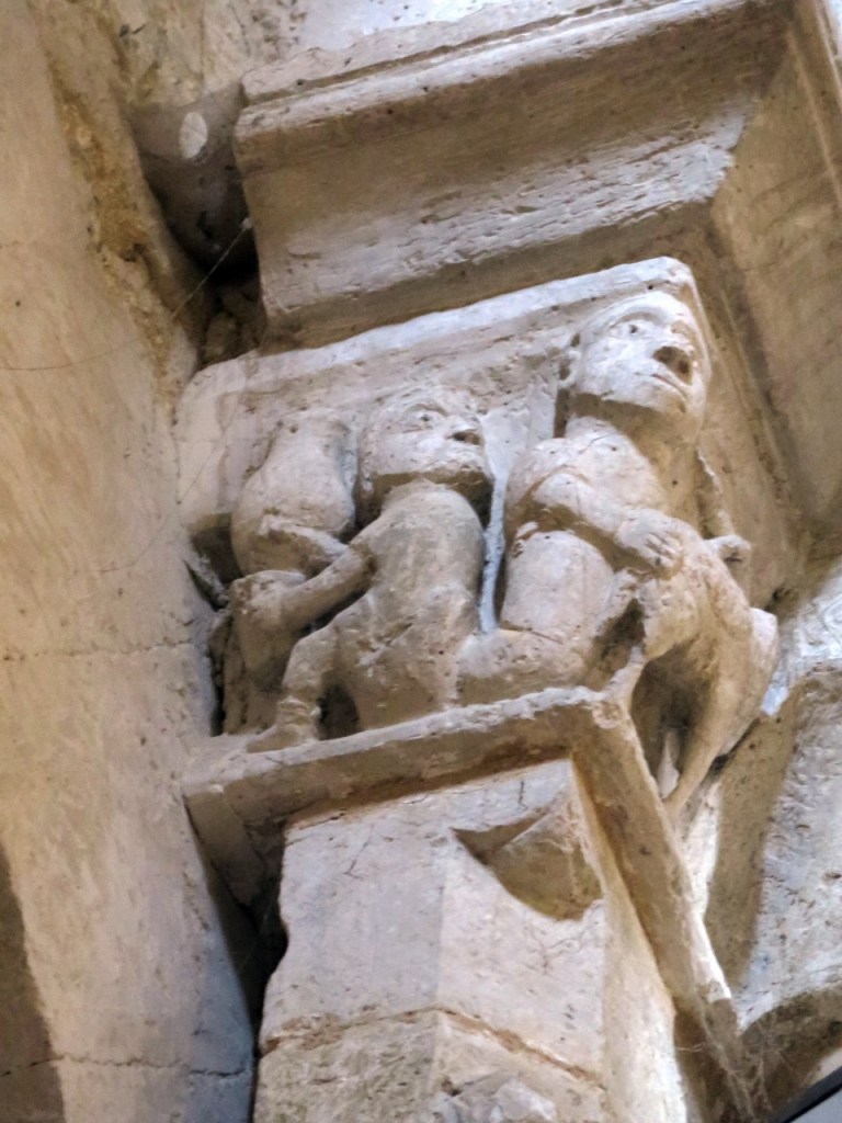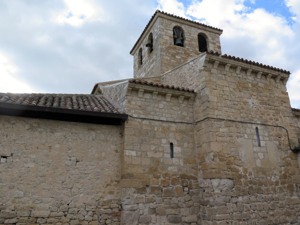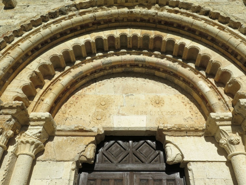 La guía aparece enseguida, dispuesta a relatar la historia de esta iglesia, cuya portada románica se abre a poniente sobre un arimez con tejaroz soportado por canecillos de cabezas de animales y de personas con gestos de burla. Orna la entrada un tímpano –en el que aparece la fecha de edificación en 1195- y tres arquivoltas de medio punto decoradas con motivos geométricos. Las columnas que soportan los arcos muestran capiteles vegetales.
