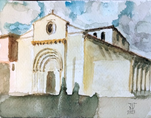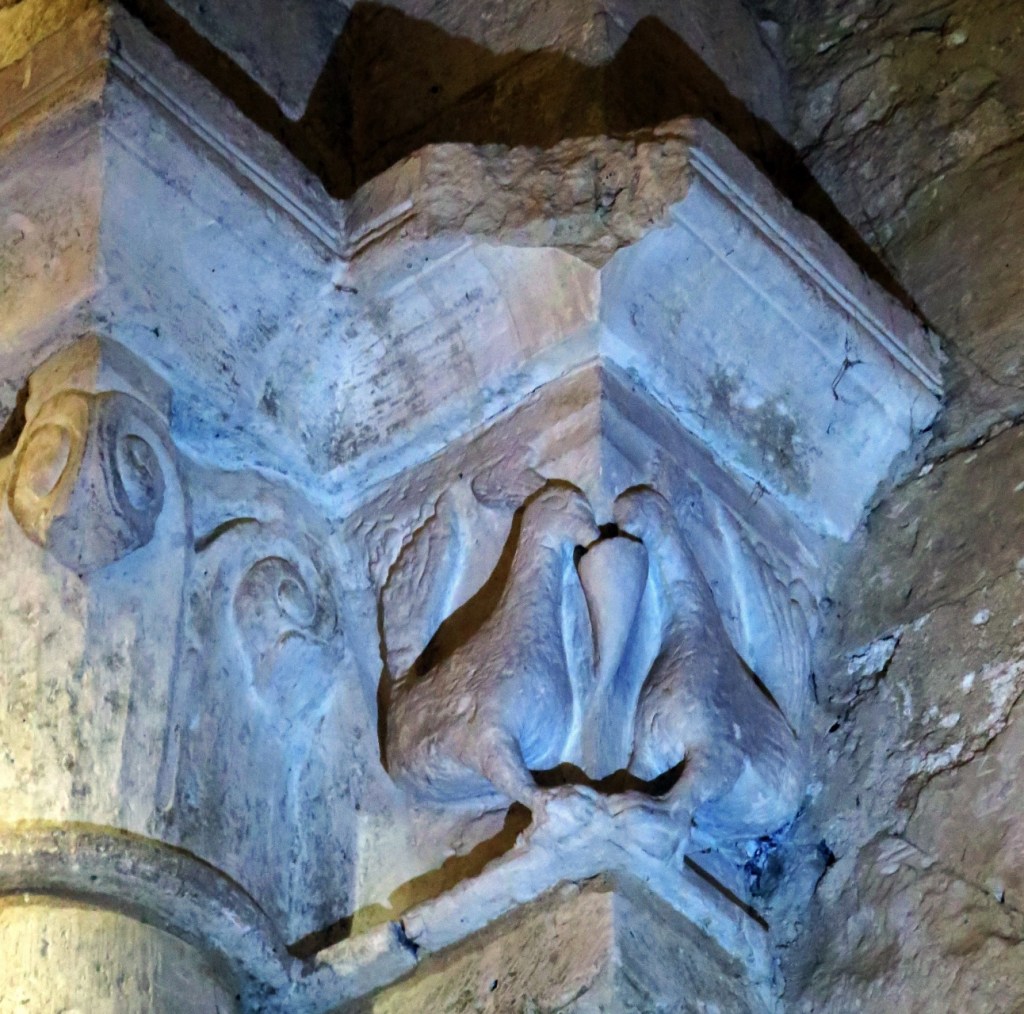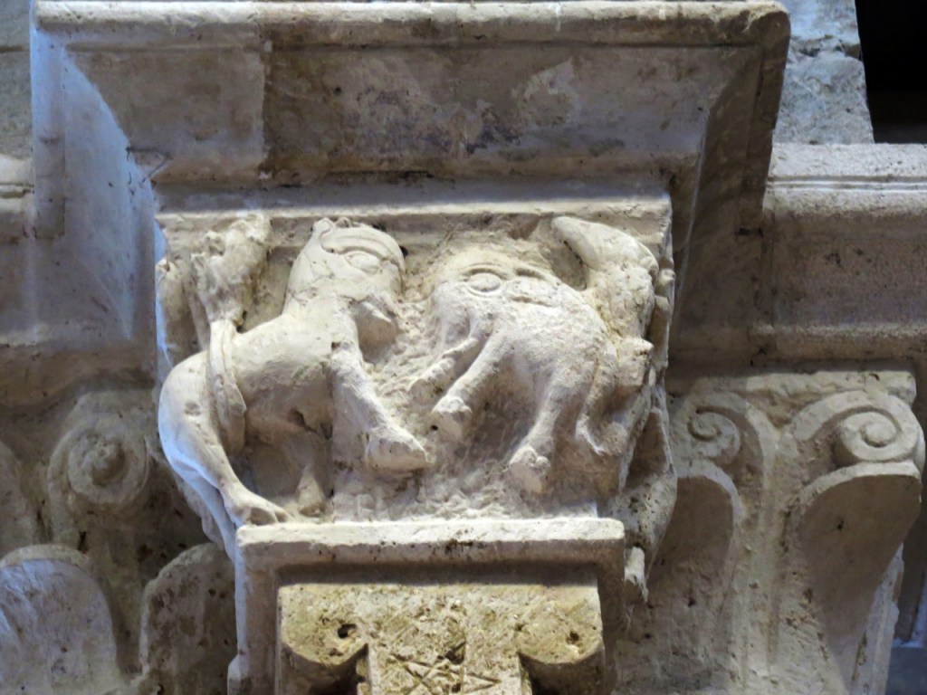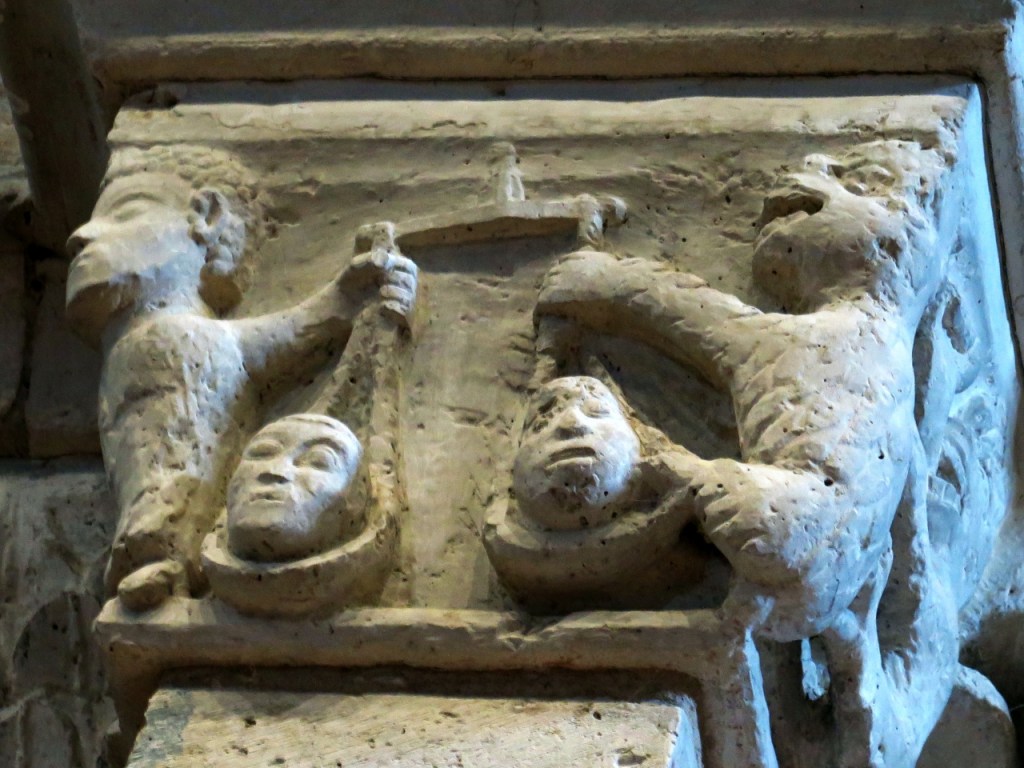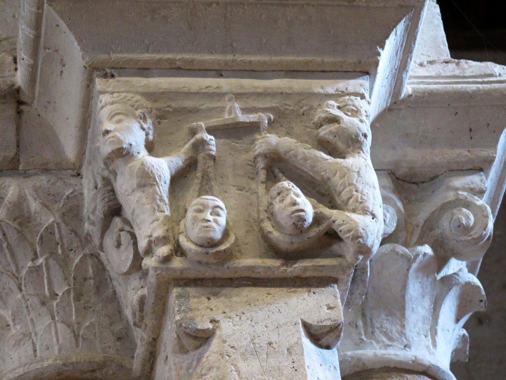La guía aparece enseguida, dispuesta a relatar la historia de esta iglesia, cuya portada románica se abre a poniente sobre un arimez con tejaroz soportado por canecillos de cabezas de animales y de personas con gestos de burla. Orna la entrada un tímpano –en el que aparece la fecha de edificación en 1195- y tres arquivoltas de medio punto decoradas con motivos geométricos. Las columnas que soportan los arcos muestran capiteles vegetales.