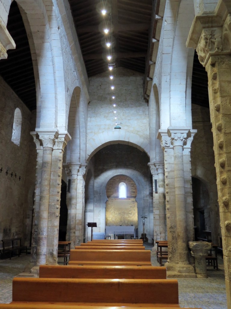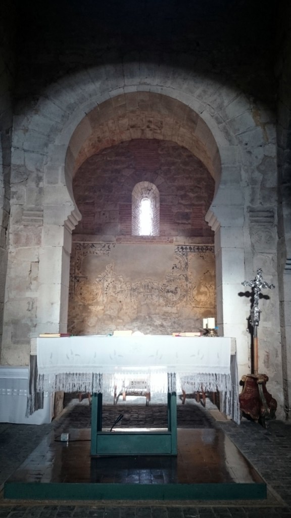 La iglesia tiene dos partes diferenciadas. La cabecera, con tres ábsides rectangulares, el primer tramo de las naves y el muro norte corresponden a lo que fue templo prerrománico, de repoblación o mozárabe, levantado hacia el siglo X. Las bóvedas son de cañón semicircular y los arcos de herradura se apoyan en pilastras. En el muro del testero central quedan restos de pinturas murales, de entre los siglos X al XII, con figuras de leones.
