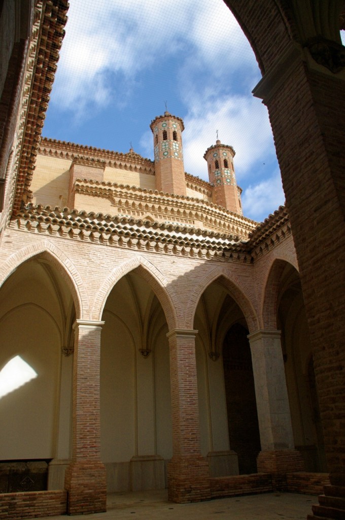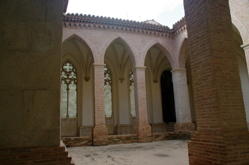 El claustro, de finales del siglo XIV, es uno de los cuatro claustros mudéjares de Aragón. La reforma de Monguió consistió en un enlucido de cemento imitando sillería y añadiendo tracerías neogóticas a los arcos, que se deterioraron rápidamente, lo que más tarde obligó a desmontarlas. Las ménsulas que adornan sus muros, también muy vistosas, corresponden a la restauración concluida en 2008.