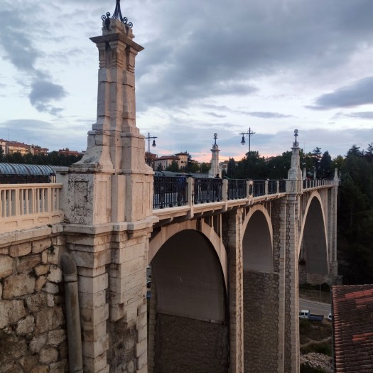 Nos dirigimos al sur de la ciudad, donde se abre otra construcción emblemática: el viaducto viejo. Fue construido en 1929 por el ingeniero Fernando Hué, de quien toma el nombre, con el propósito de mejorar la comunicación de la ciudad con el Levante y facilitar la expansión urbanística al sur. Su gran arco central de hormigón armado fue récord español en su momento. El viaducto, en efecto, da paso al barrio del Ensanche, con casas de buena factura, el barrio de una burguesía con posibles.
