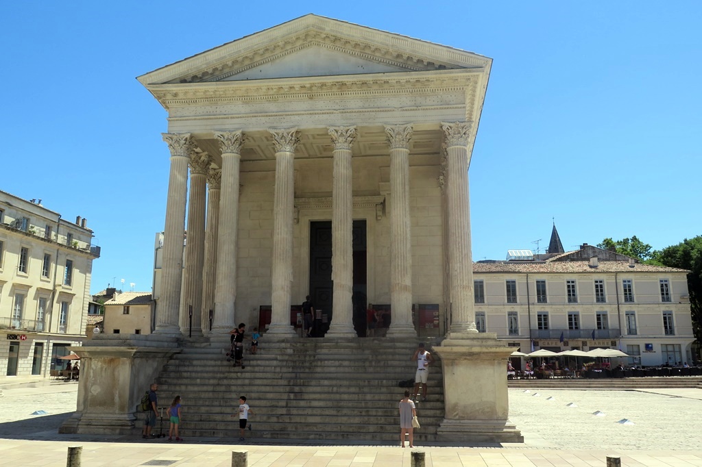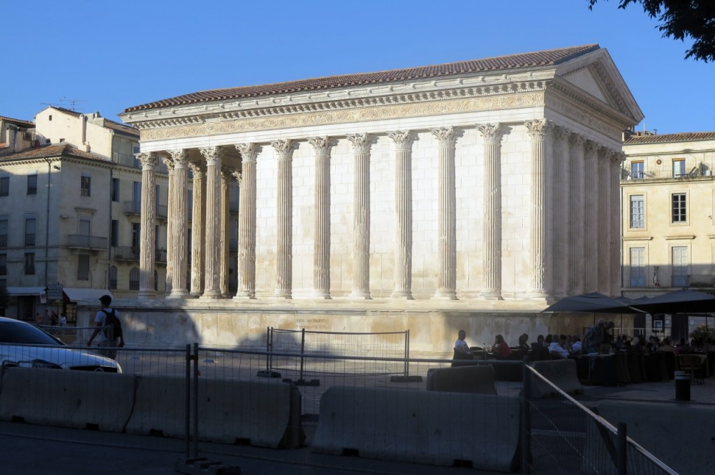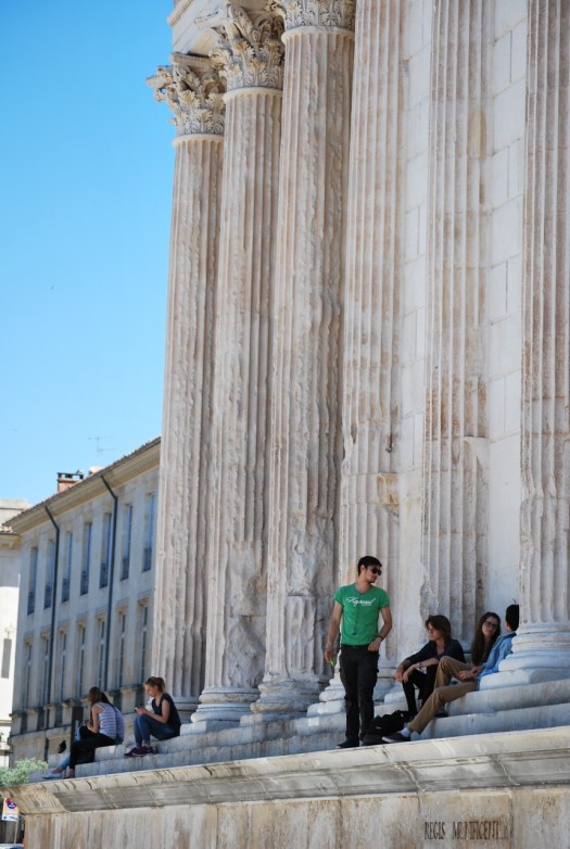 La Maison Carrée –la Casa Cuadrada- es un templo de mármol construido en el año 16 a.C. por Augusto, con seis columnas en la parte frontal y diez en los laterales, de las que ocho están integradas en los muros. Es el templo más antiguo que se conserva íntegramente. Lo cual tiene su mérito porque nimeños y visitantes acostumbran a solazarse sobre las venerables piedras y, según nos contaron en el lugar, los fines de semana es punto de reunión para la movida local.