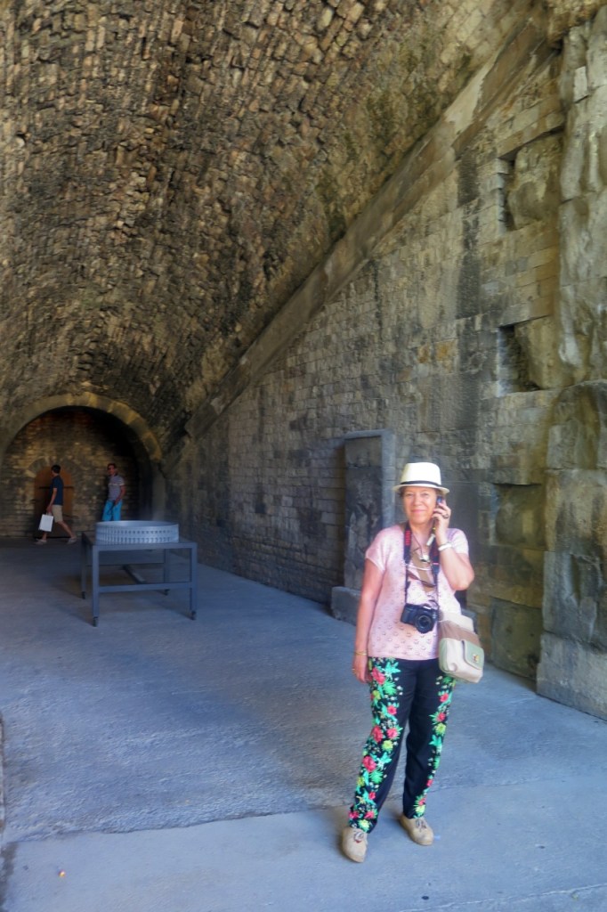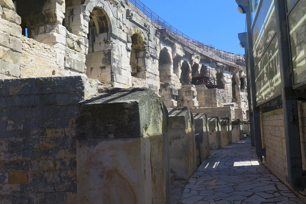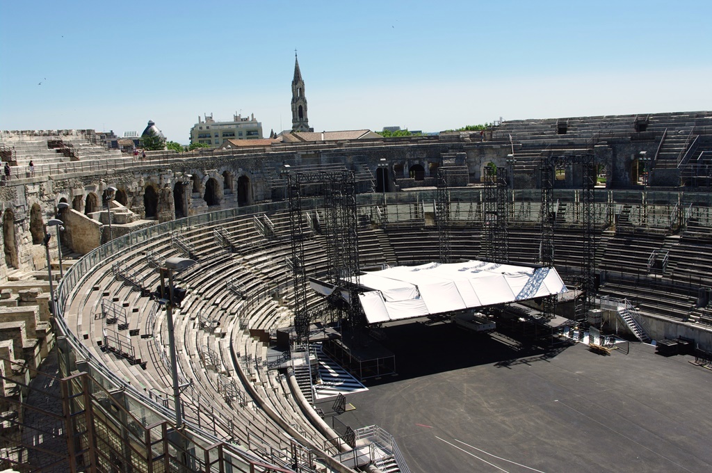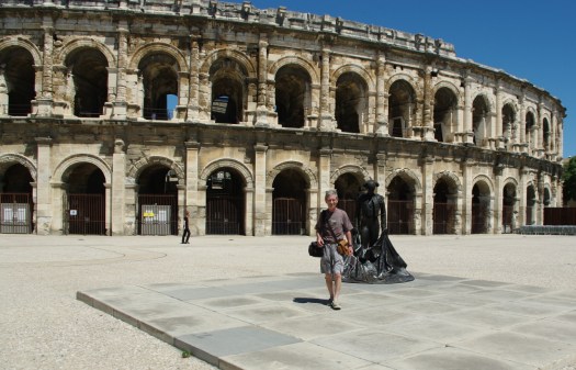 Pero el colega quería venir a Nimes y aquí estamos, pisando el albero de la Arena, el anfiteatro romano mejor conservado del mundo, dice la información turística, construido a finales del primer siglo de nuestra era. Aparentemente está bien conservado, lo que parece milagro, teniendo en cuenta la afición de los nimeños a meter mano en él a lo largo de los siglos. Los vizcondes de Nimes tuvieron la idea de construir dentro su palacio-fortaleza, con el tiempo se fueron levantando casas alrededor del palacio hasta contarse unas cien viviendas y dos capillas. Así, hasta que en el siglo XVIII se derribaron todas ellas y se le devolvió su aspecto original. En el coso se celebran corridas de toros y espectáculos varios. Nuestra visita coincide con la celebración de los festivales de verano así que el anfiteatro aparece semicubierto con una estructura metálica muy poco romana, francamente.