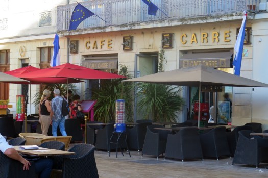 En un lateral de la plaza se extienden varias mesas, con sus correspondientes sombrillas, atendidas por un cafetín que toma el nombre del monumento. Elegimos el lugar para comer a un paso de la Maison Carrée y erramos. El Café Carrée tiene una carta mediocre y un mal servicio. Nos hacen esperar bajo un sol que no logra paliar la sombrilla, comemos regular y nos vamos asados al punto mientras los camareros se pasean entre las mesas como si fueran modelos de alta costura.