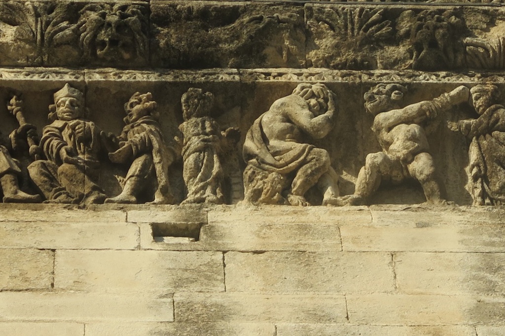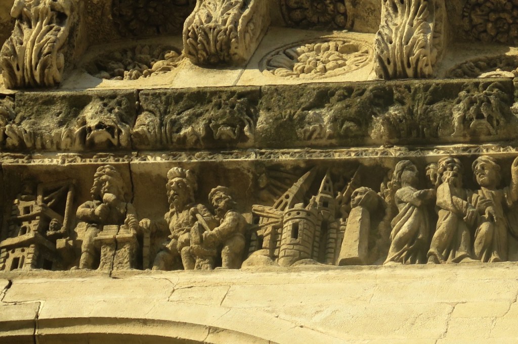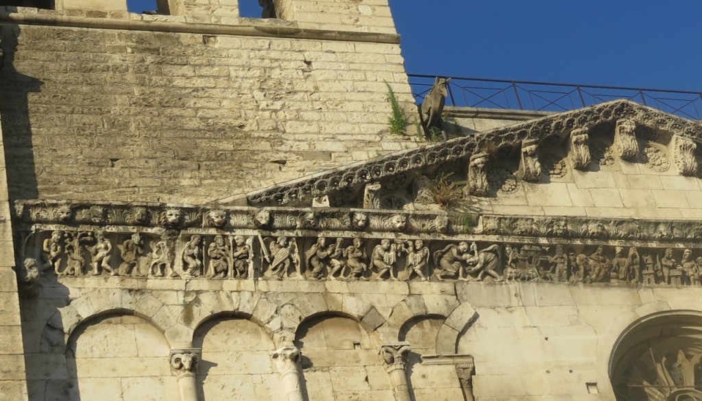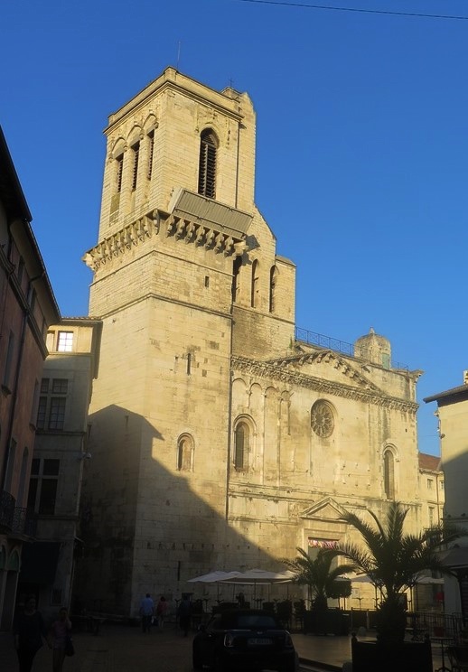 La catedral de San Castor fue construida en 1646 sobre restos de una iglesia merovingia del siglo XI levantada con restos romanos, demolida y reconstruida dos veces en los siglos XVI y XVII. Estamos a punto de pasar de largo, pero, al acercarnos, descubrimos el friso que se extiende en la parte superior de su fachada, tenido por uno de los mejores exponentes de la escultura románica en el midi francés. A partir de Adán y Eva, ahí está la biblia en piedra. Los seis primeros grupos escultóricos son obra del siglo XI, el resto son algo posteriores.