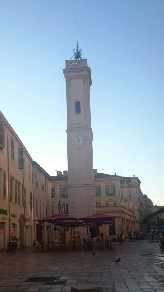 Hacemos una pausa en nuestro recorrido nimeño para tomar un refresco bajo la torre del Reloj, en la plaza que lleva su nombre y que viene a ser el corazón de la ciudad medieval, una zona que durante el día está atestada. Porque en Nimes coexisten tres ciudades superpuestas: la romana, la medieval y la moderna. Las campanas de la torre del Reloj marcaban las horas, advertían de incendios y llamaban a los ediles a las sesiones municipales. Es el símbolo del poder de la ciudad, aunque el Ayuntamiento se trasladó a su emplazamiento actual en 1702. La torre se reconstruyó en 1754, cuando amenazaba derrumbarse. A finales del siglo XIX se derribó el antiguo Ayuntamiento, quedando la torre aislada, convertida en el único adorno de la plaza. Ella y la catedral son los exponentes de la riqueza medieval nimeña.