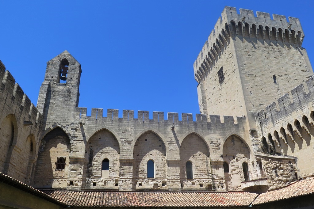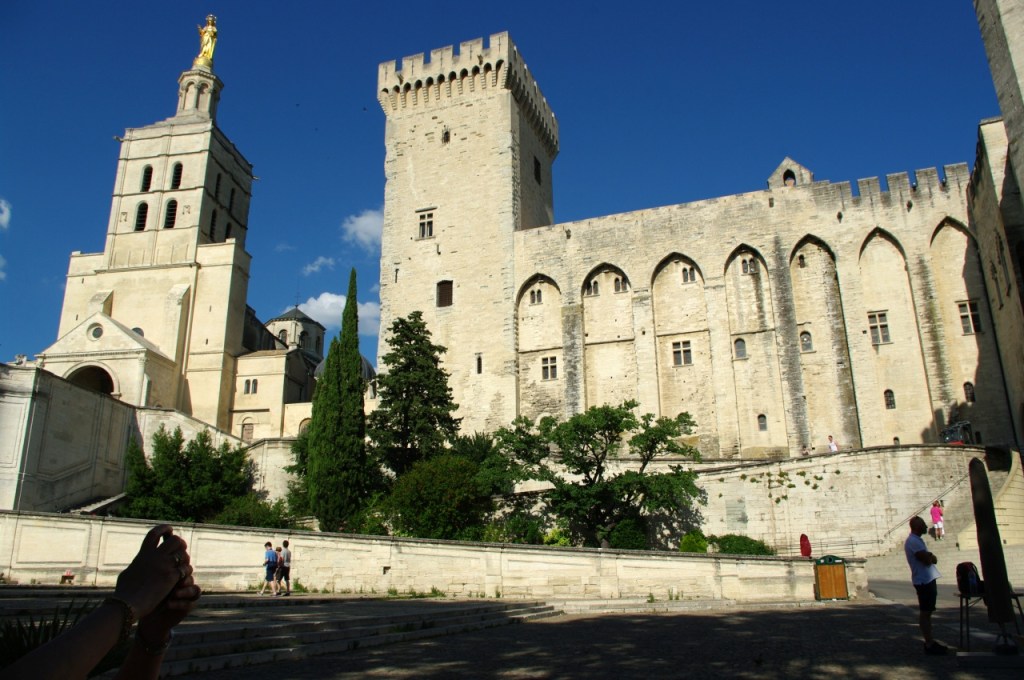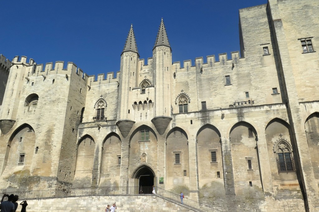 La residencia de los papas ocupa más de 15.000 metros cuadrados, sus muros tienen cinco metros de grosor, es la más grande de las construcciones góticas de la Edad Media y un importante palacio gótico. En realidad, lo que llamamos el palacio son dos: el viejo, de Benedicto XII, y el nuevo, de Clemente VI. Las obras se iniciaron en 1316 y acabaron en 1370 y en su decoración participaron artistas del momento como Simone Martini y Matteo Giovanetti. El recinto se completa con el Petit Palais, al oeste de la plaza, y la catedral románica de Notre Dame de Doms, en la parte norte del palacio.