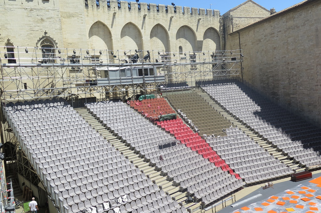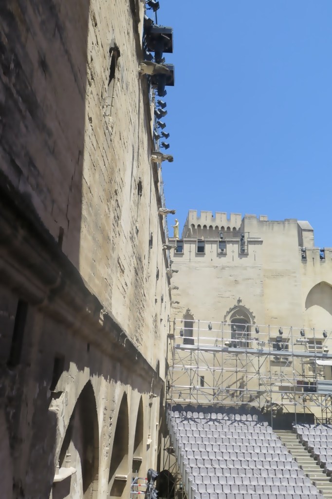 Durante el mes de julio, Aviñón es sede de un importante festival de teatro, de manera que el patio del palacio está acondicionado también para esta programación, lo que condiciona la visita e impide contemplar una parte del itinerario.