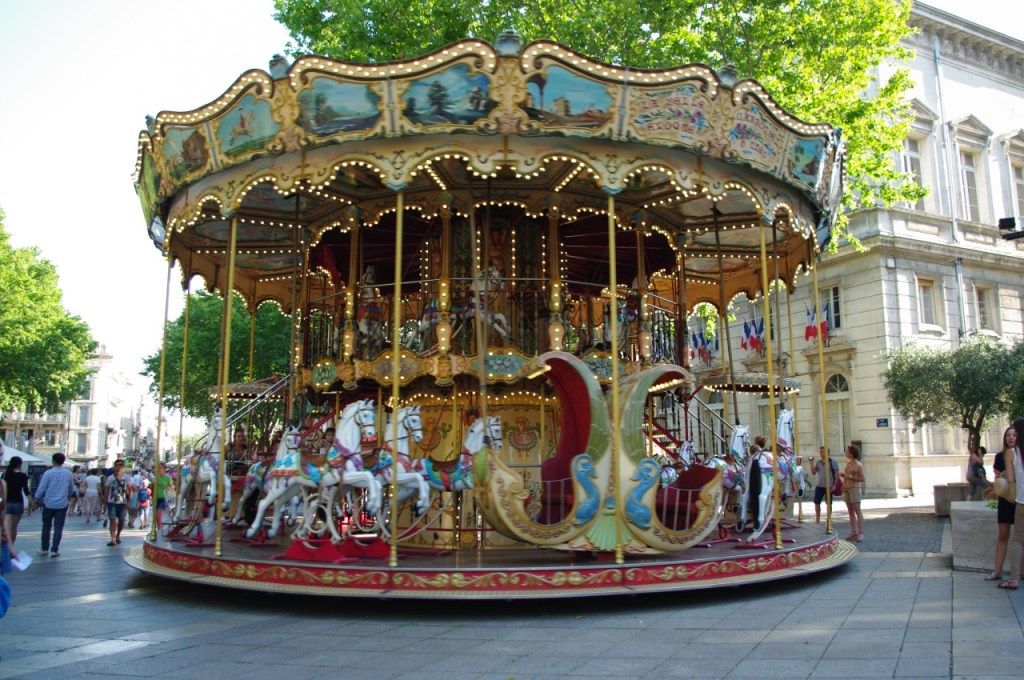 Después de la visita, encontramos mesa en la plaza del Reloj, con el teatro de la Ópera a la vista. El Colega, que va cogiendo el punto a sus implantes dentales, elige un restaurante para desquitarse de los purés y merlucitas que se tiene comidos en este tiempo: La Boucherie (La carnicería). Pide un solomillo de buey y yo un carpaccio, ambos platos con las inevitables patatas fritas, de los que damos buena cuenta bajo una especie de carpa humedecida con chorritos de vapor que alivian las altas temperaturas. La plaza es uno de los epicentros de la gastronomía local y, efectivamente, está llena de familias aviñonesas y unos pocos forasteros.